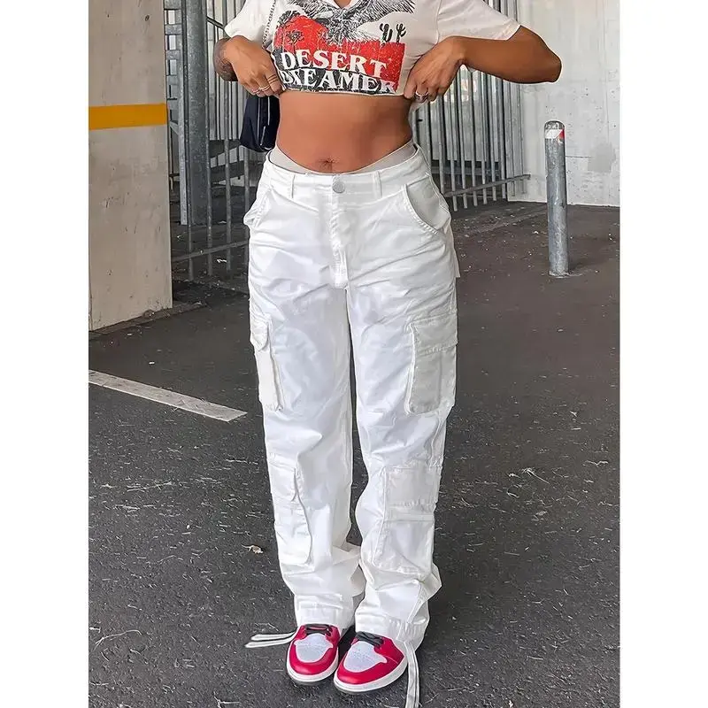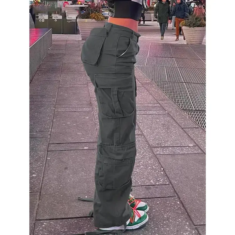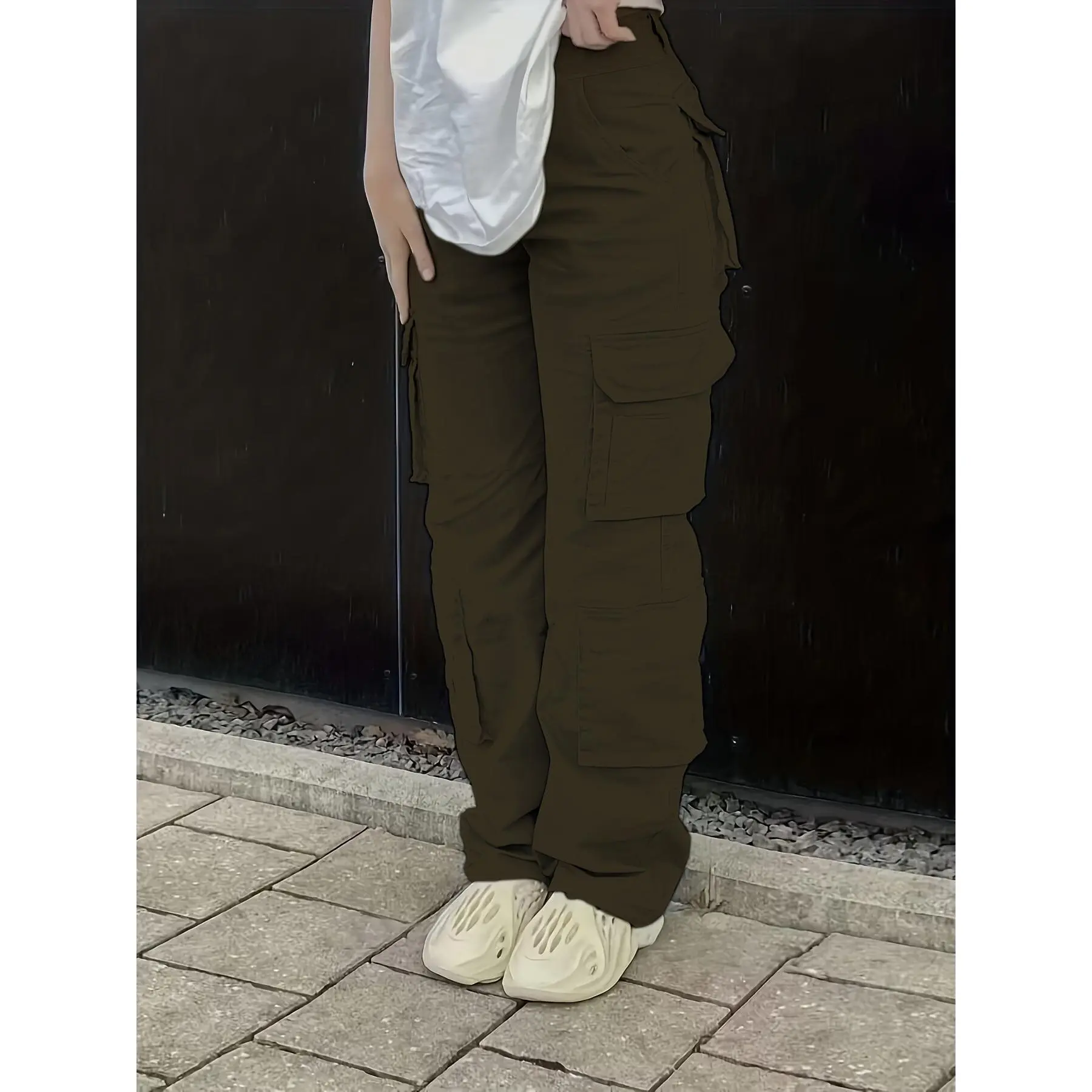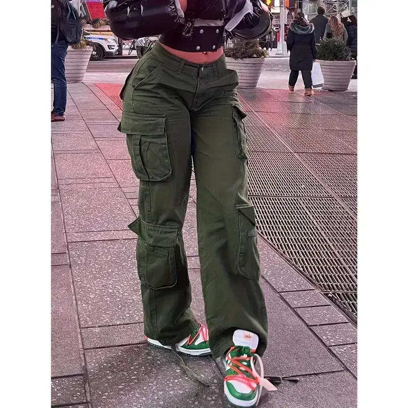 Plus Size Y2K Pants, Women's Plus Solid Wide Leg Baggy Cargo Pants With Flap Pockets