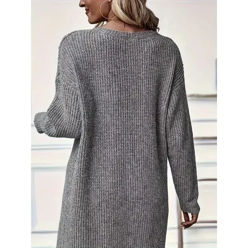 Neckline:Round NeckMaterials:AcrylicRegion Of Origin:ChinaSeason:Fall&WinterSleeve Type:Drop ShoulderPattern:PlainQuantity Per Pack:Dress length: LongStyle:CasualWashing Instructions:Dry Clean,Hand Wash OnlyWeaving Method:KnittingDesign:Wrap,Asymmetrical,High LowSleeve length: long sleeveComposition:Acrylic [Drop Shoulder]: The drop shoulder sleeve adds a relaxed silhouette, allowing for freedom of movement while maintaining an effortlessly chic appearance. [Soft Fabric]: Crafted from acrylic, this garment has a medium stretch that provides a soft touch against the skin, promoting pleasant wear during cool weather. [Sleek Neckline]: Round neckline enhances a flattering look for all body types, ensuring a sophisticated touch that pairs easily with necklaces.