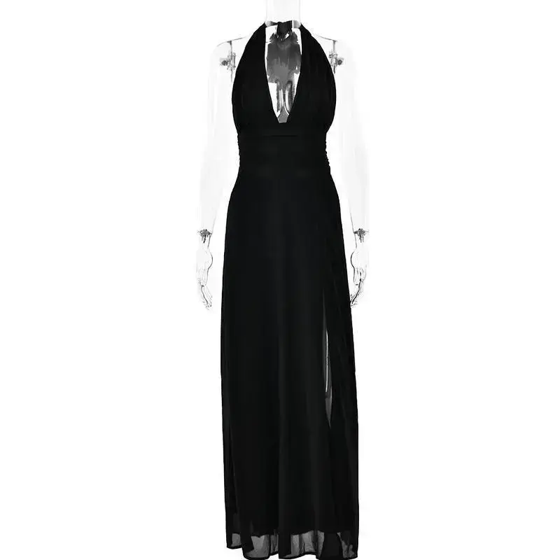 White Dres2025 Women's Clothing V-neck Halter Lace-up Backless Slit Dress Fashion Temperament Long Dress