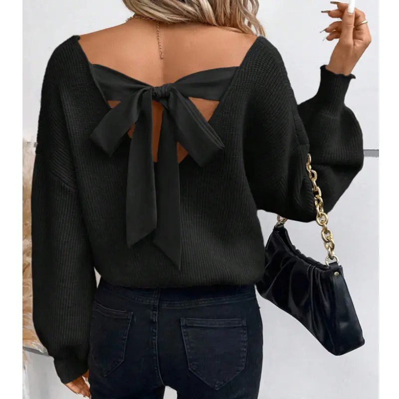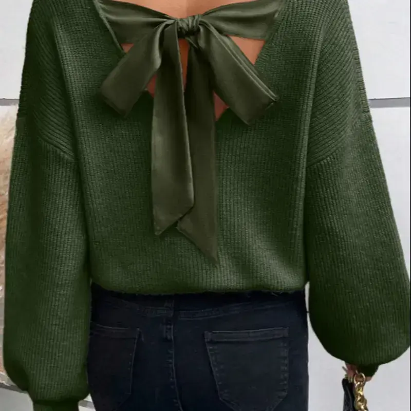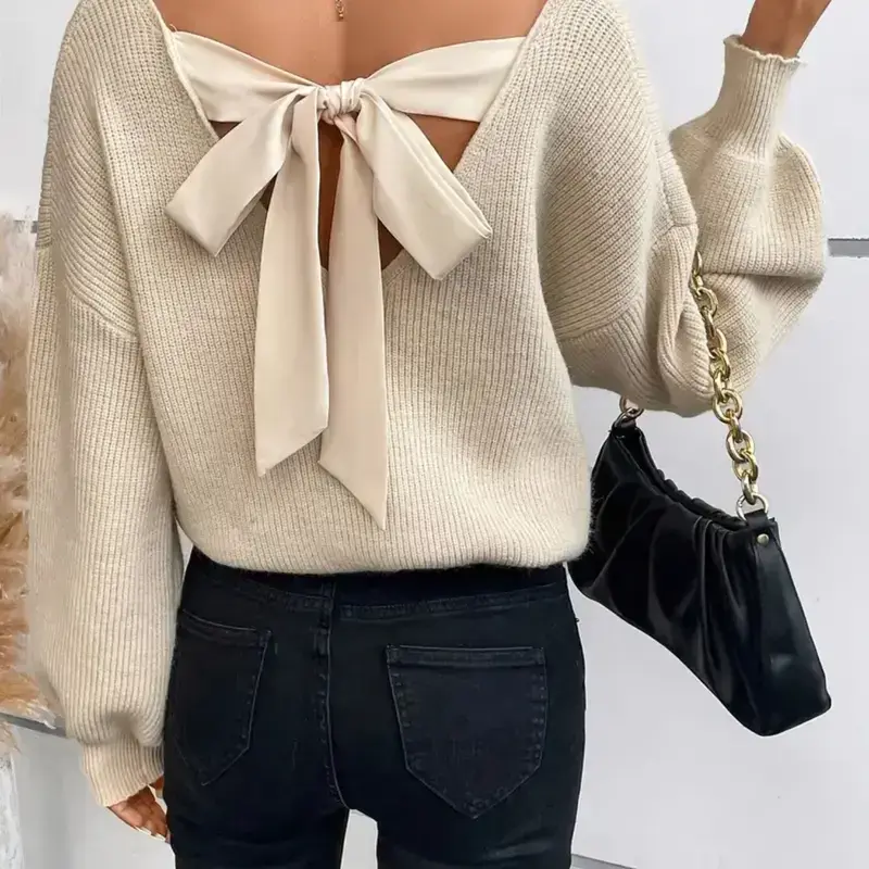 Women's Long Sleeve Sweater with Bow at Back, V Neck Knit Top for Fall & Winter, Fashionable Casual Layering Tee
