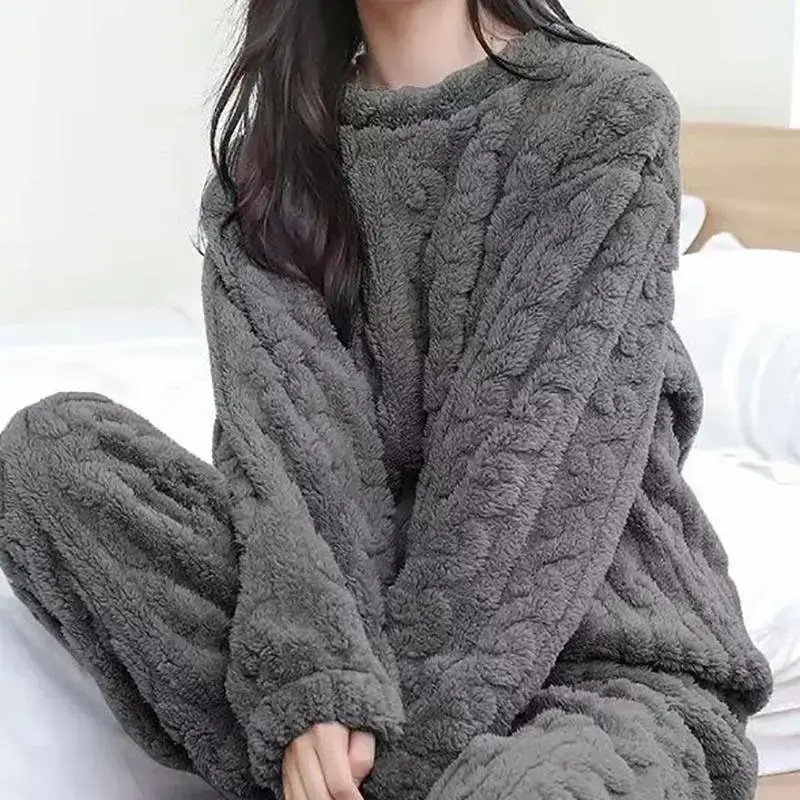 Autumn Women Solid Warm 2 Piece Sets Thicken Velvet Ribbed Fleece Set Pullover And Pants Women Casual Pajama Sets 2025 Can be used with raincoat
