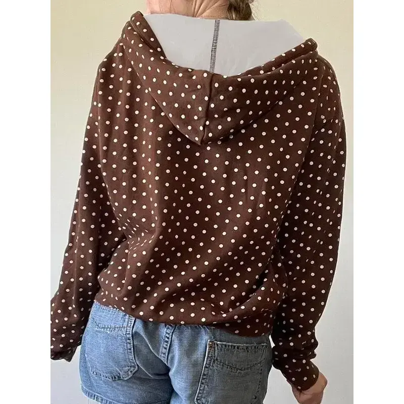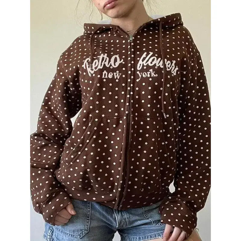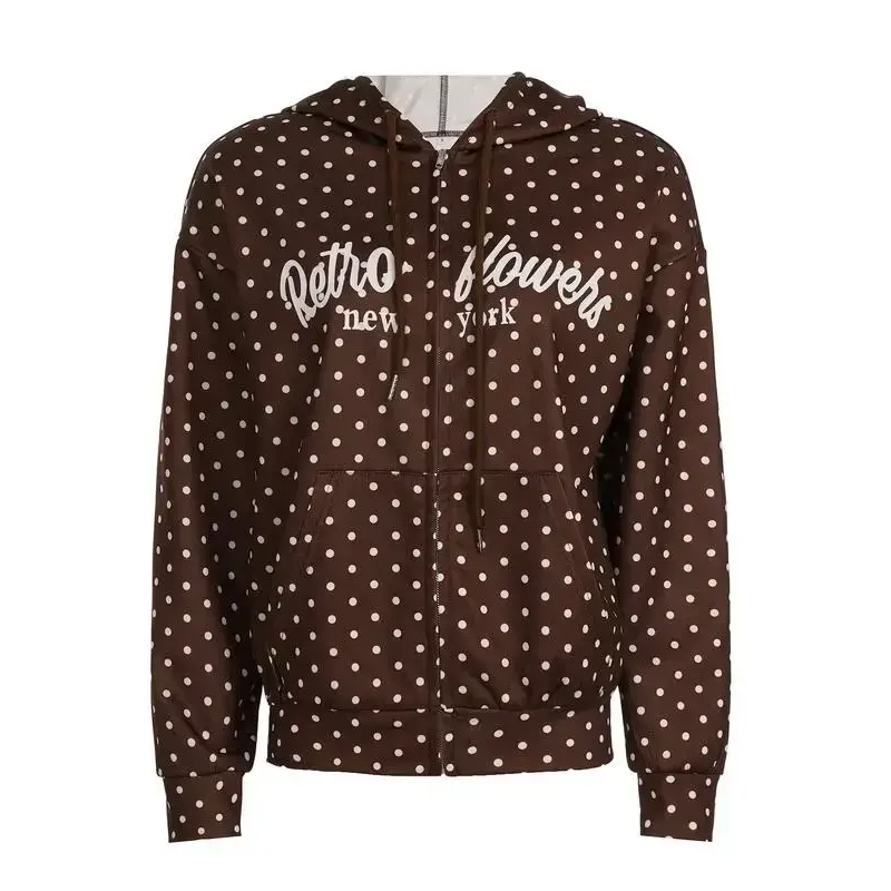 Women's Fall Winter Polka Dot Hoodie Jacket, American Retro Style Letter Print Casual Loose Fit Sweatshirt Coat