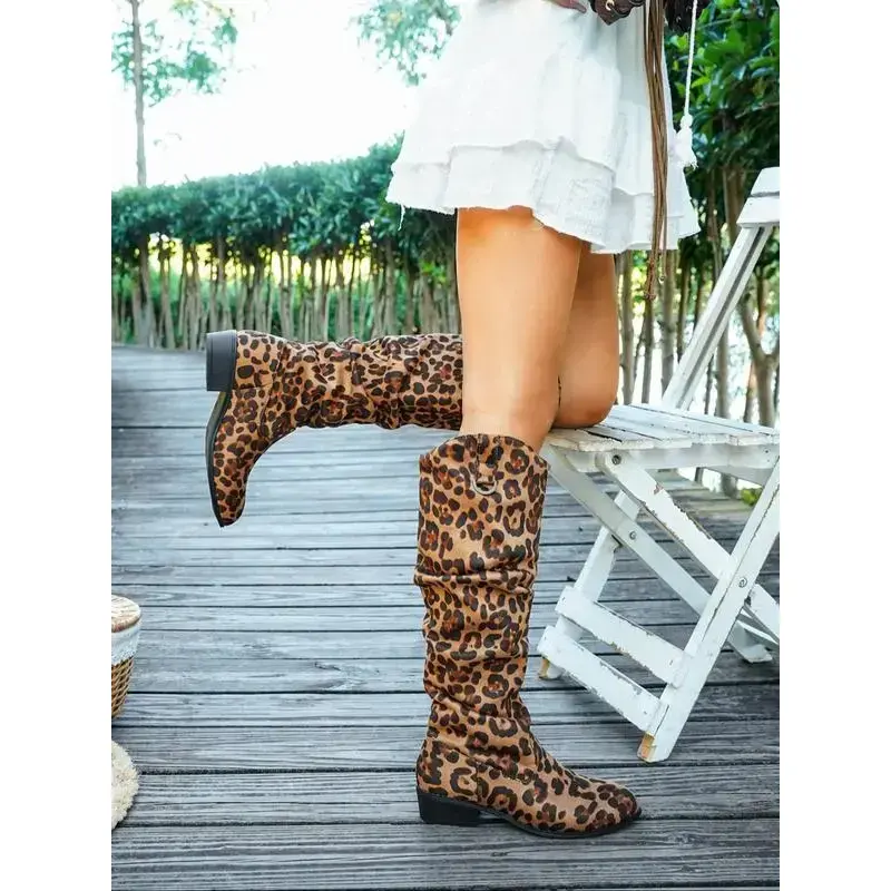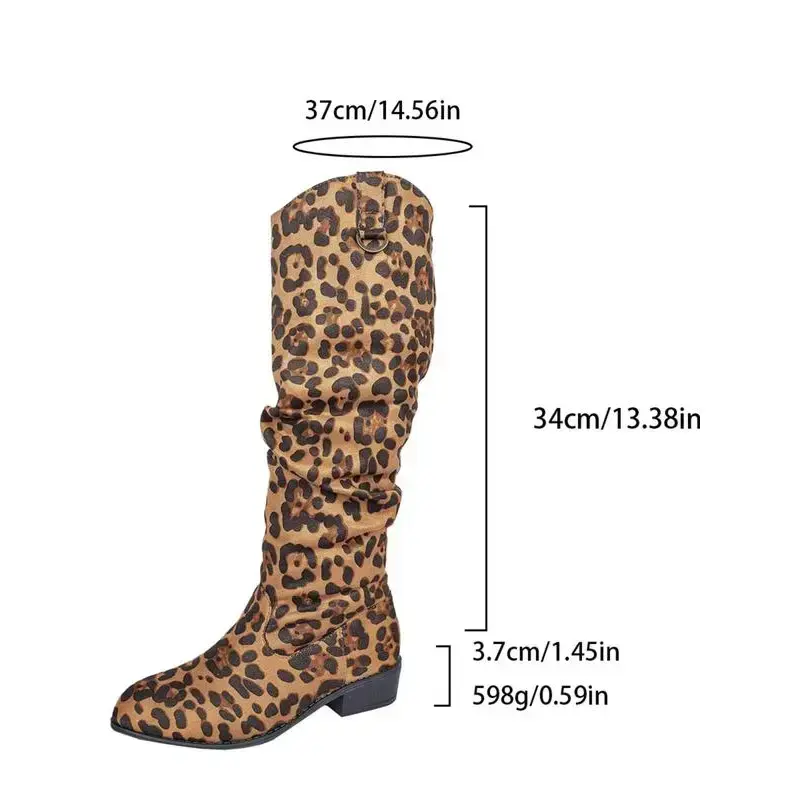 【Distinctive Print】: The leopard print adds a bold visual appeal, setting it apart from conventional knee-high boots. 【Convenient Closure】: Equipped with a buckle decoration for easy wear and removal, ensuring quick styling without hassle. 【Warming Upper】: Crafted from textile materials, these boots provide warmth during the colder autumn and winter seasons. 【Durable Sole】: Constructed with a robust rubber sole, guaranteeing traction and longevity for various terrains. 【Above Ankle Height】: Designed to reach above the ankle yet below the knee, offering a balanced look with added coverage.
