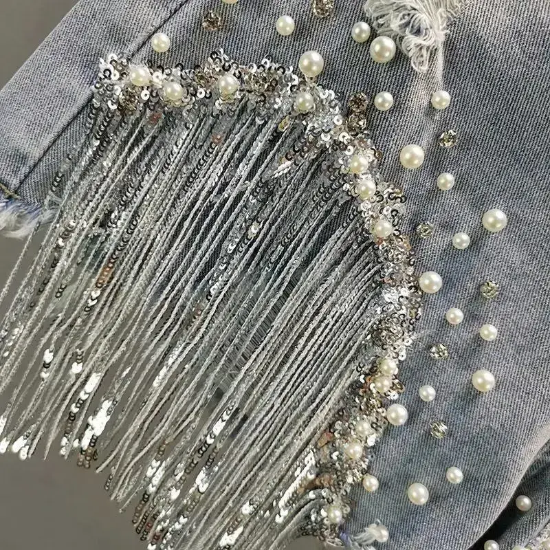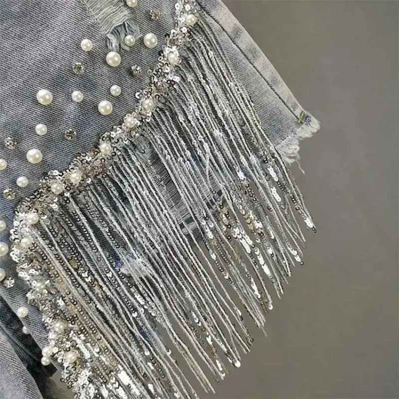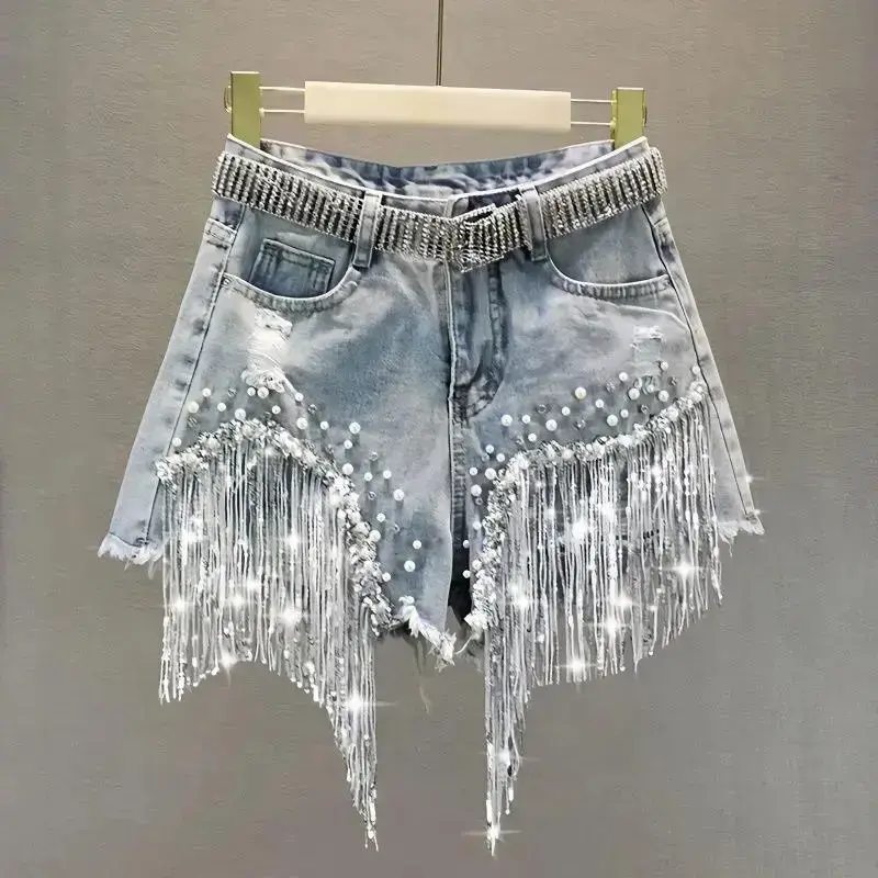 Denim Shorts Women's 2025 Summer Clothes New European High Waist Thin Heavy Industry Beaded Sequined Fringed Broken Copper Jeans Womenswear Bottom Streetwear Fitted Pants Trouser Basic Blue_Beige Minimalist