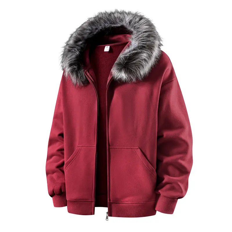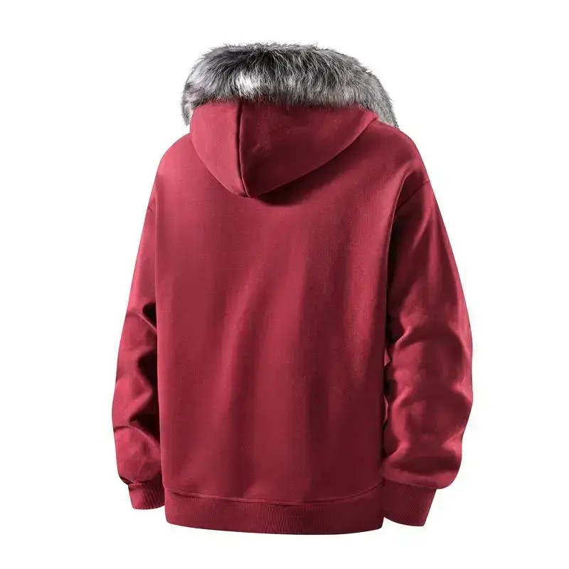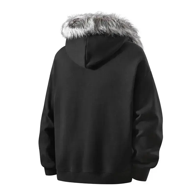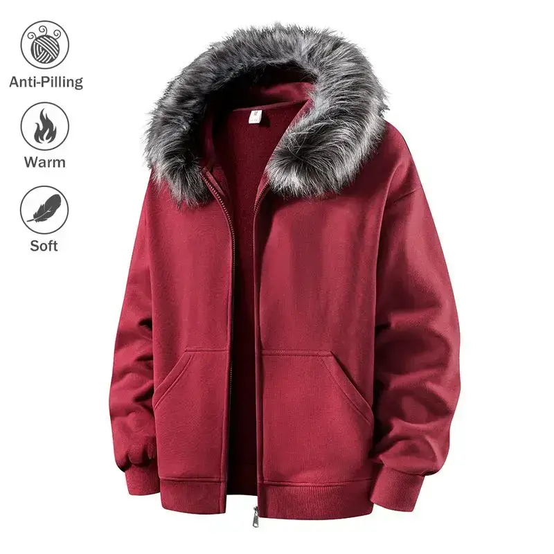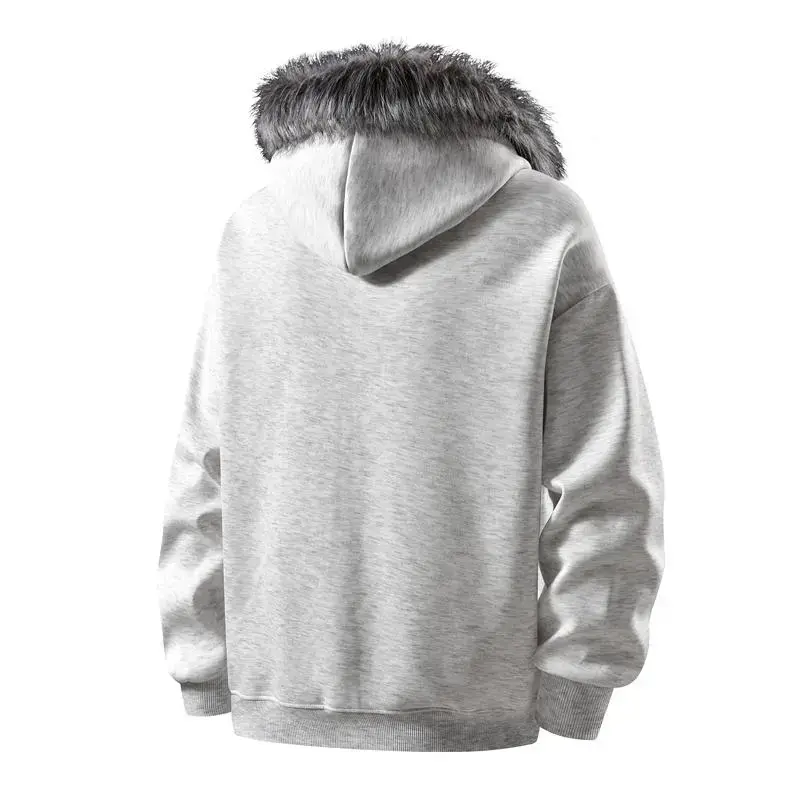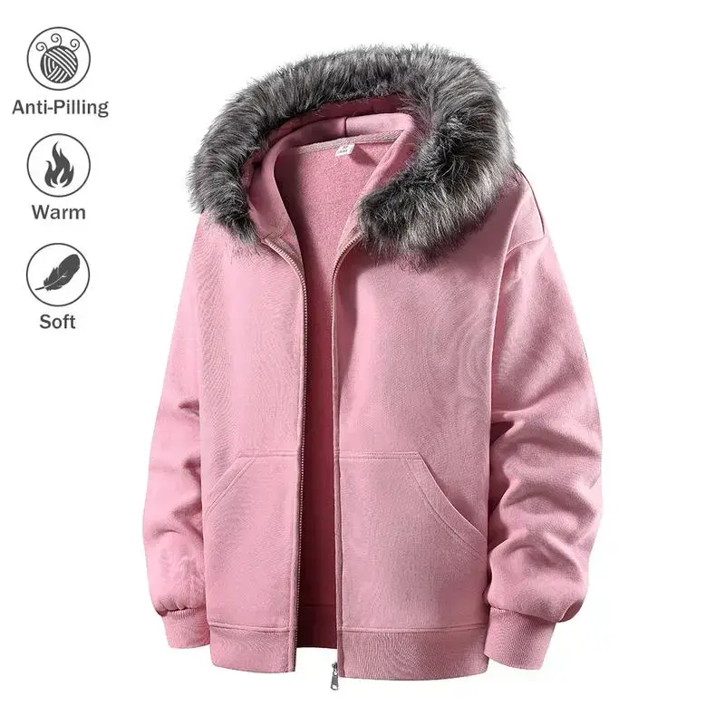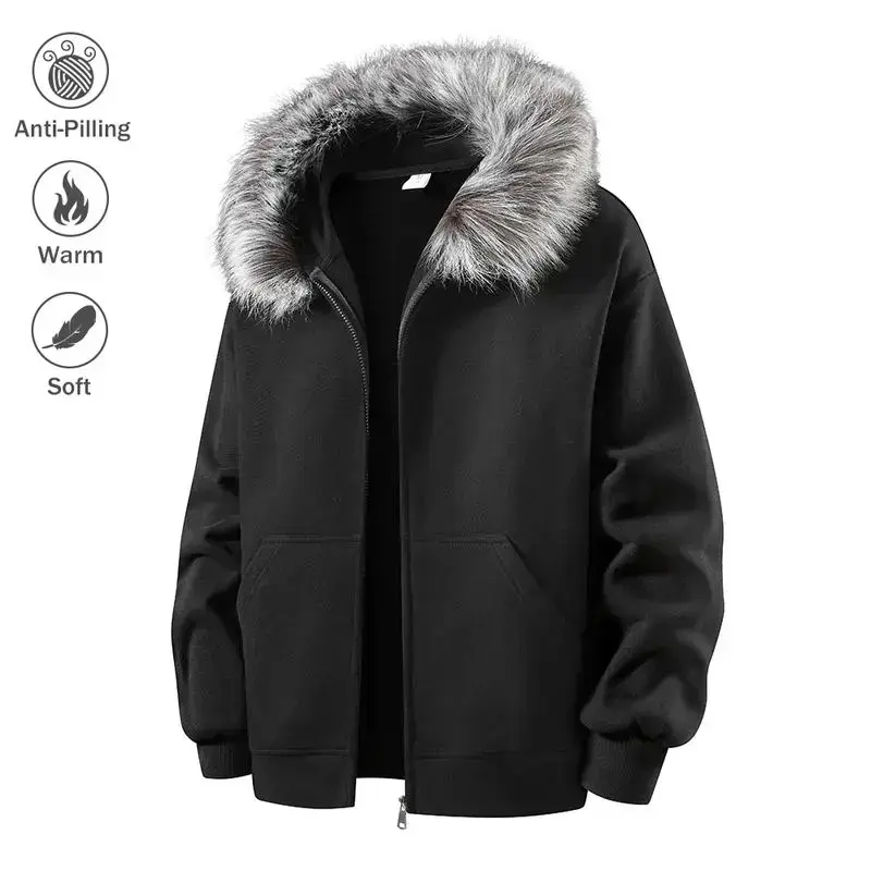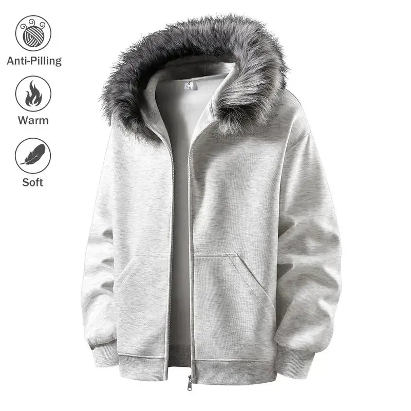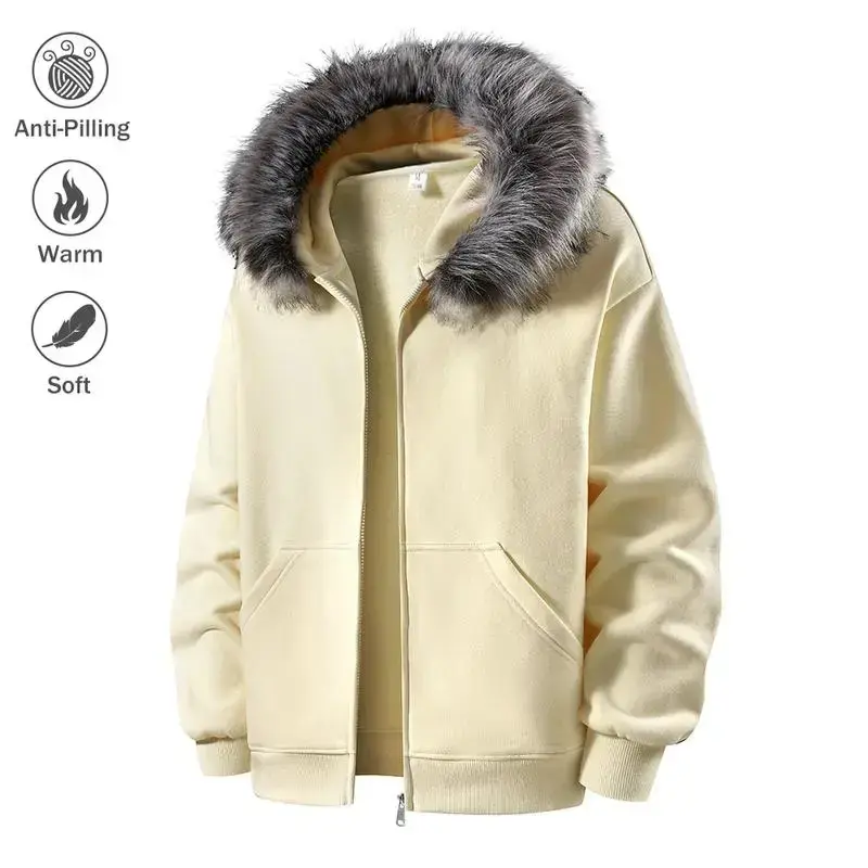 Men's Hooded Zipper Jacket Autumn Winter Faux Mink Fur Collar Warm Anti-Pilling Soft Casual Loose Fit Sweatshirt Cardigan Coats Menswear Beige Long Sleeve