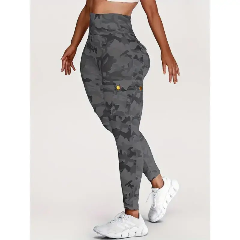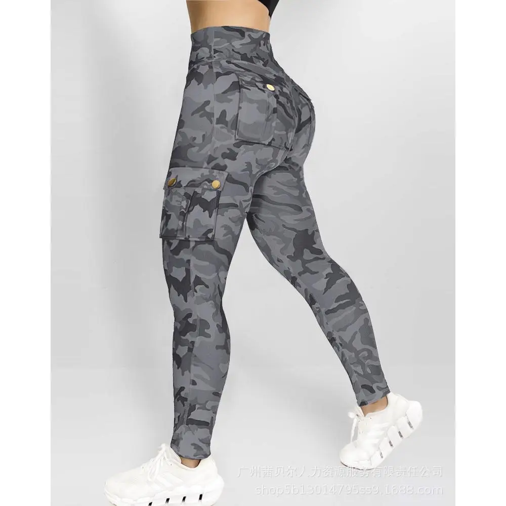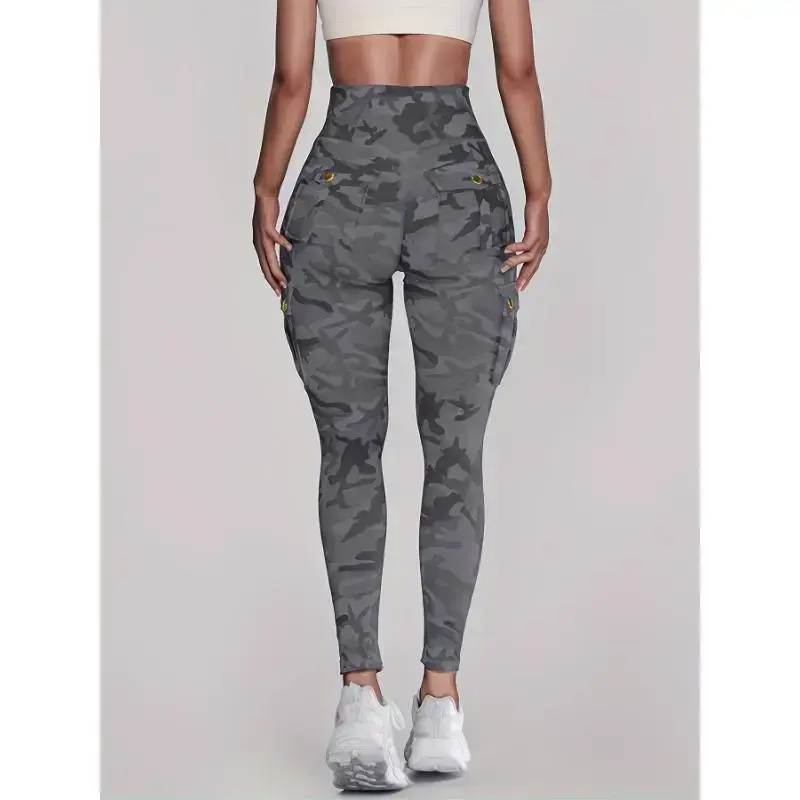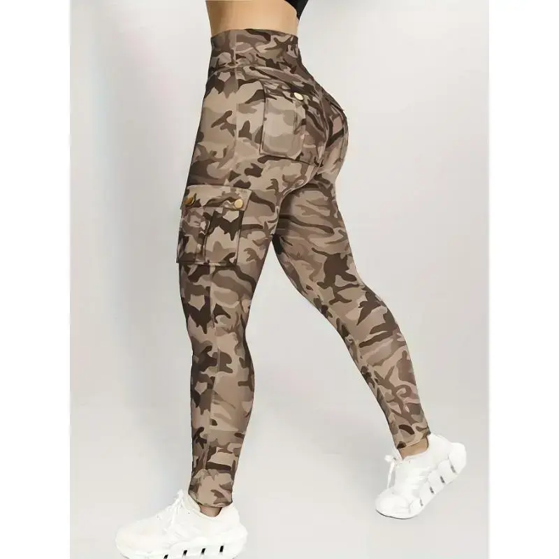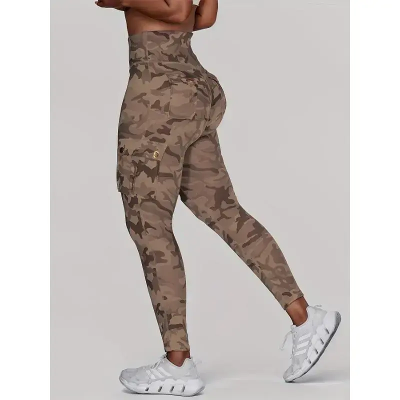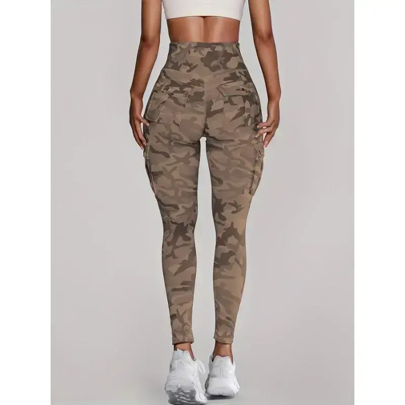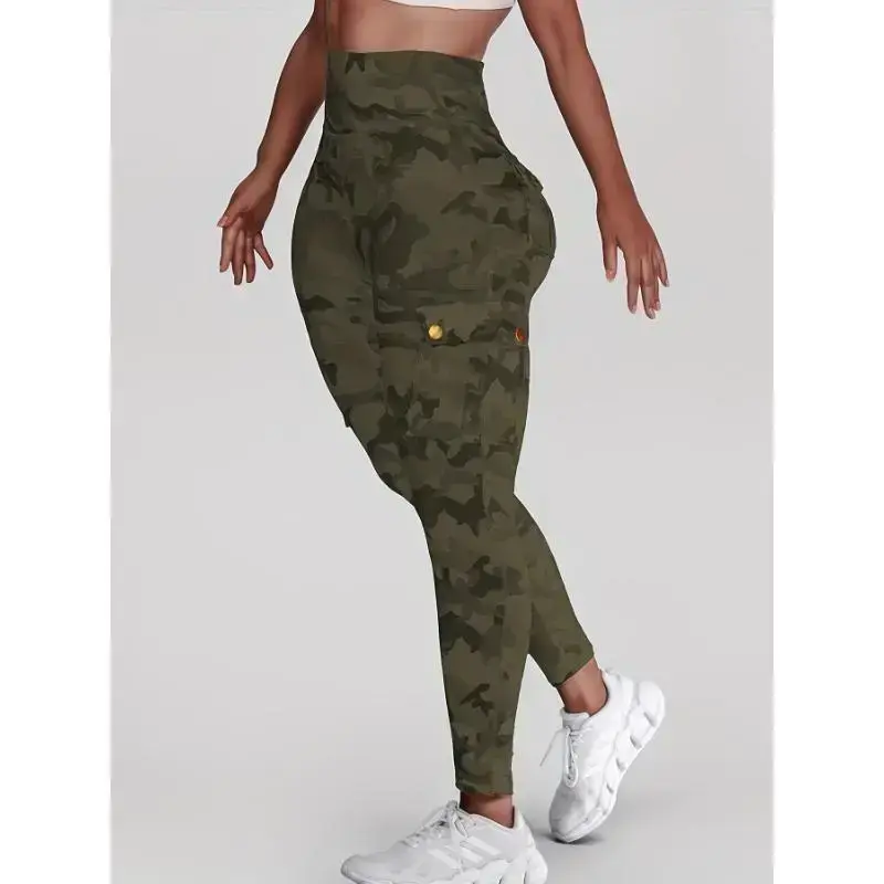 Army Green Camouflage Printed High Waisted Workwear Patch Pocket Skinny Yoga Bottom Pants Athleisure Style Comfortable