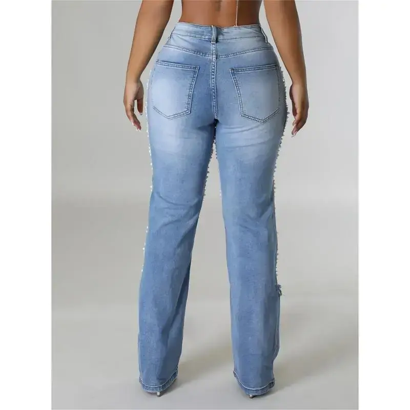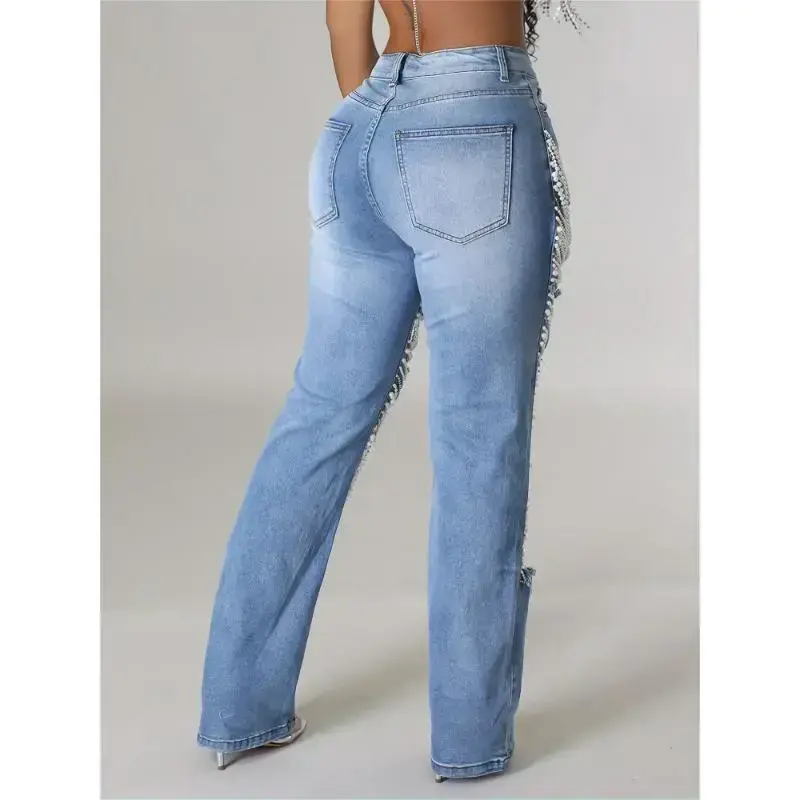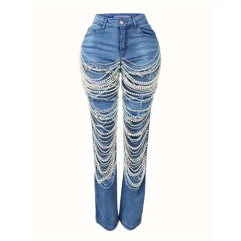 [Mid-Rise Distressed Ripped Jeans] Straight Leg Jeans for Women Mid-Rise Distressed Ripped Hole Pearl Chain Boyfried Denim Pants
