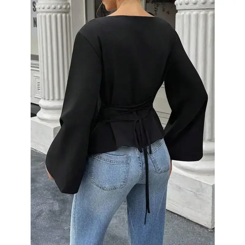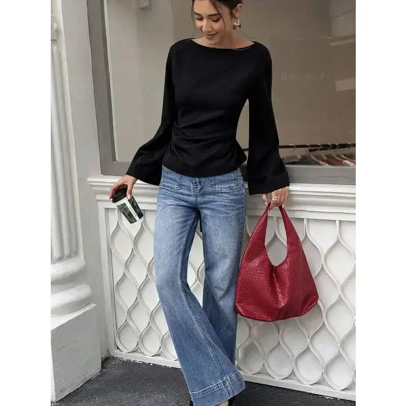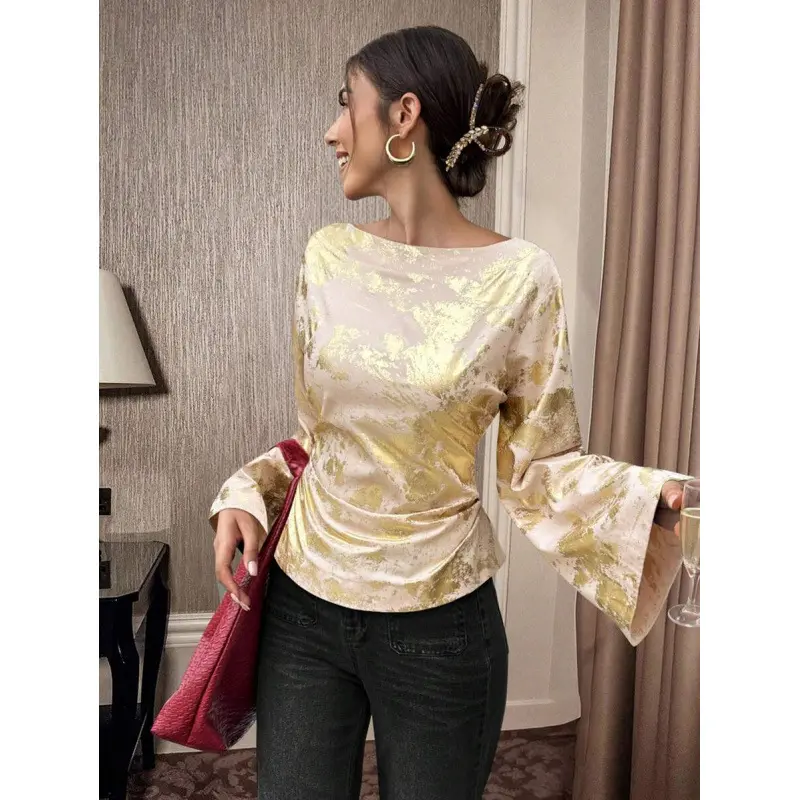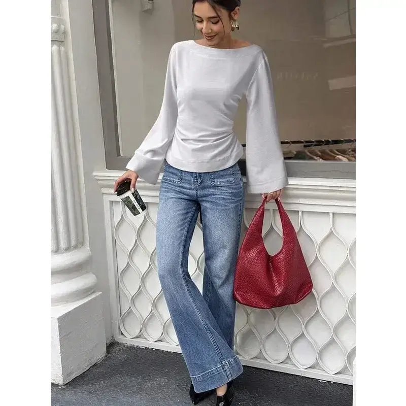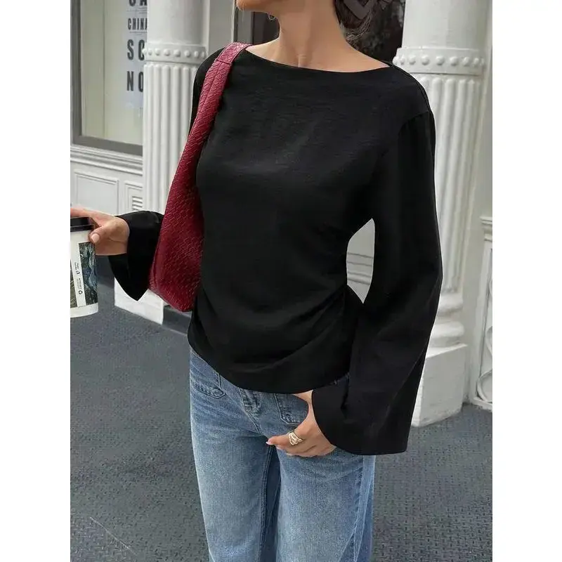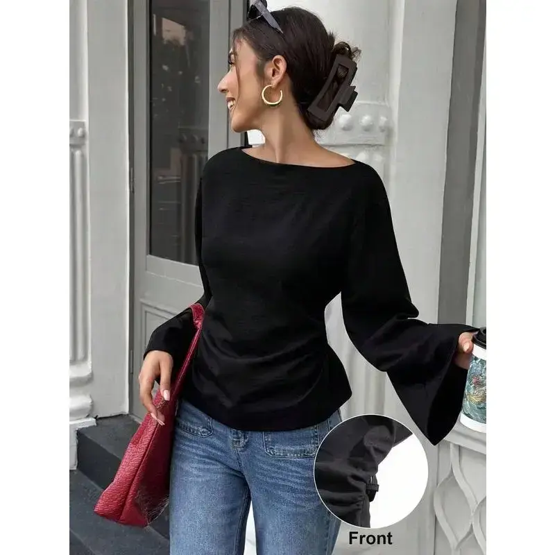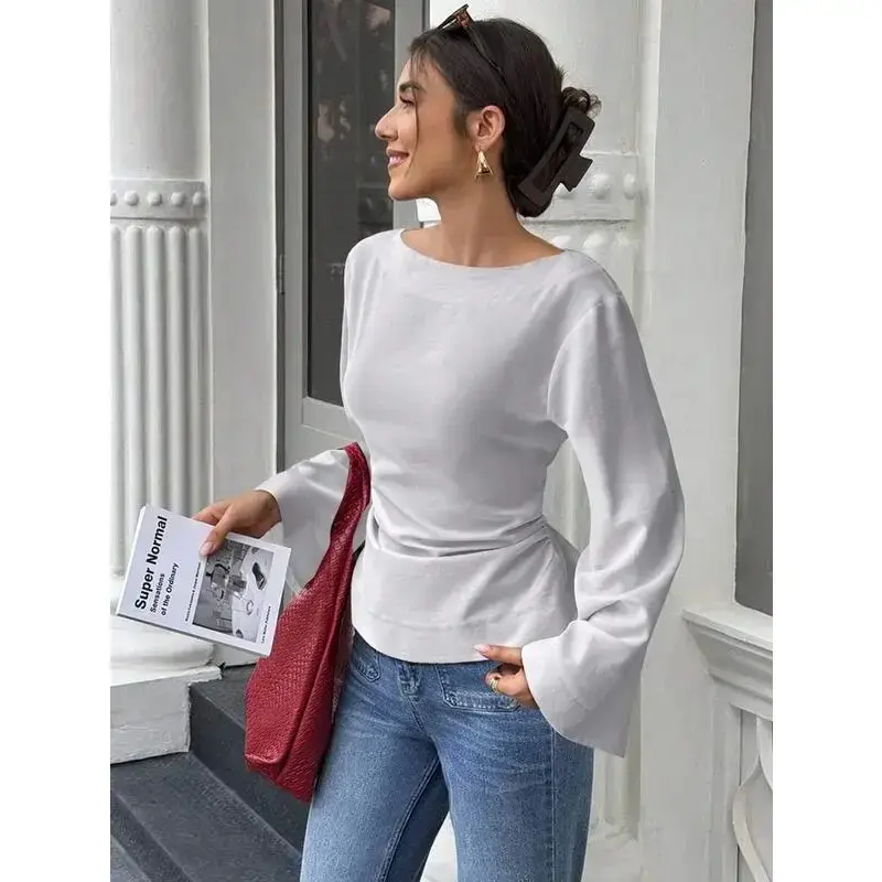 Women's Solid Color Boat Neck Long Flare Sleeve Ruched Fashionable Versatile Blouse Shirt
