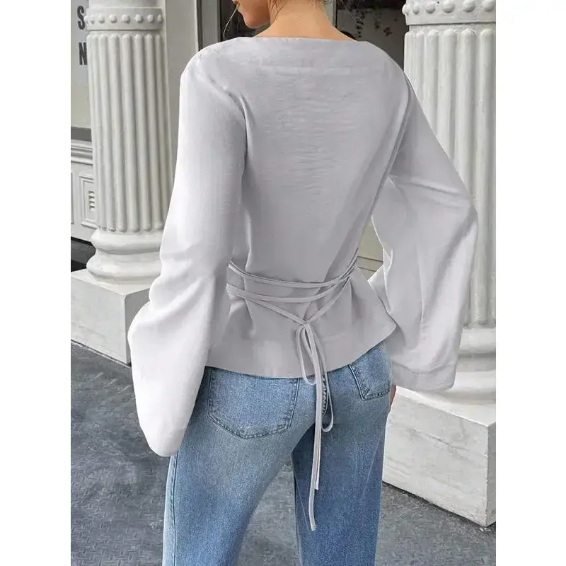 Occasion:Daily Festivals:Teachers' Day Type:Top Lined For Added Warmth:No Pattern Type:Plain Body:No Details:Asymmetrical Style:Casual Color:Light Grey Hem Shaped:Asymmetrical Sleeve Type:Flare Sleeve Neckline:Boat Neck Sleeve Length:Long Sleeve Length:Regular Fit Type:Regular Fit Fabric Elasticity:Non-Stretch Material:Woven Fabric Composition:100% Polyester Care Instructions:Machine wash or professional dry clean Sheer:Semi-Sheer