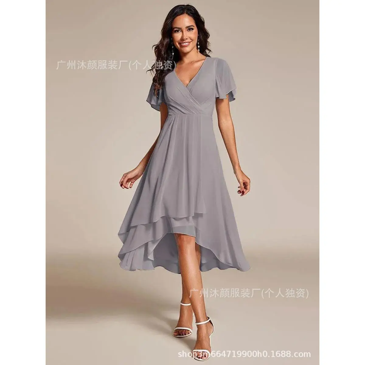 New Ruffles Sleeve Pleated V-Neck A-Line Midi Chiffon Evening Holiday Party spring Dress Formal Womenswear Elegance 02084 Workwear Basic Minimalist Shortsleeve Ruffled Fabric Garment Elegant