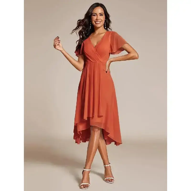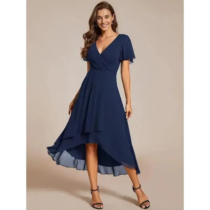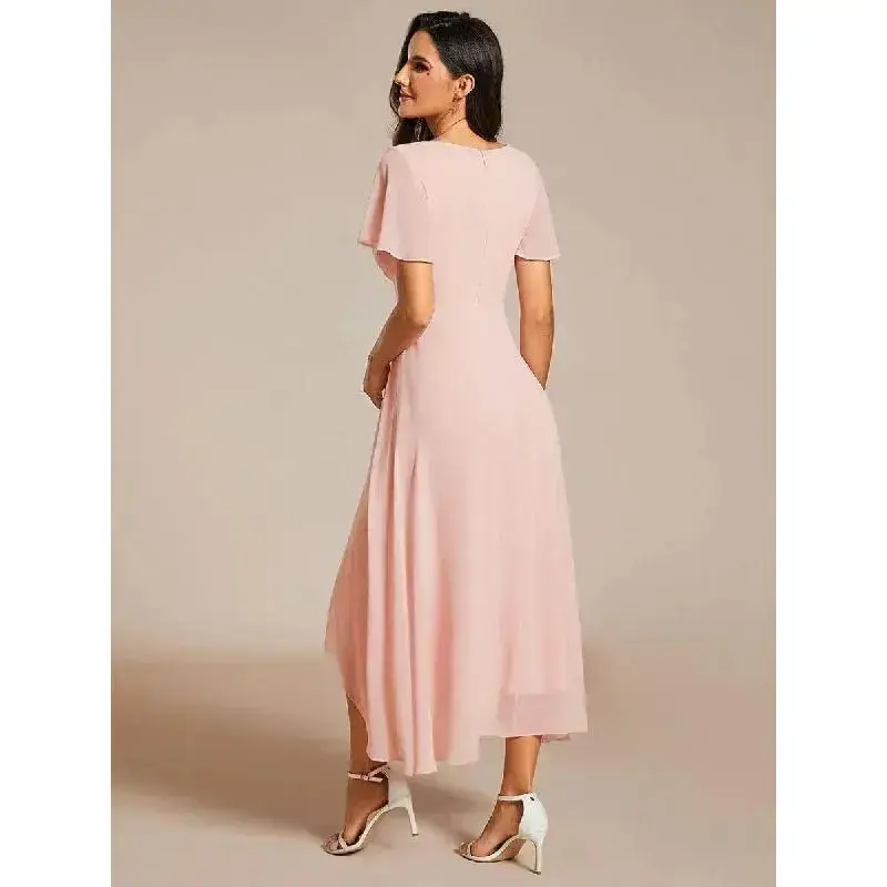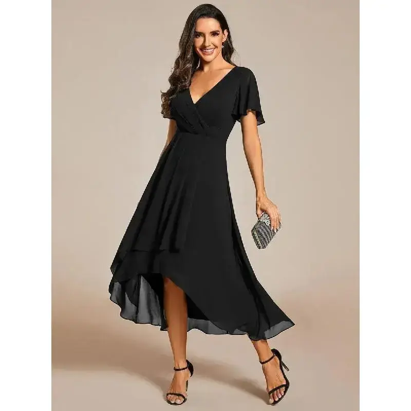 Sleeve length: short sleeve/Country of Origin:USA/Dress Style:Elegant,Minimalist/Style:Casual,Basic,Elegant,Classic/Season:All Seasons/Size Type:Regular/Dress Length:Midi/Sleeve Type:Regular/Neckline:V-Neck/Occasion:Anniversary,Shower,Bachelorette Party,Birthday,Bridal Shower/Pattern Type:Plain/Contour Type:A Type/Closure Type:Zip/Material:Chiffon/Type:A-Line/Design: Ruffle/Washing Instructions:Hand Wash Only,Dry Clean/Elevate your style with our Ruffles Sleeve Pleated V-Neck A-Line Midi Chiffon Wedding Guest Dress. The delicate ruffled sleeves and pleated detailing add a touch of romance to this enchanting midi dress. The flattering A-line silhouette and V-neck create a timeless and sophisticated look. Crafted in chiffon, this dress is for wedding guests who desire both elegance and comfort./Fit: Please refer to size chart./Length:Tea length./Sleeve Style: Short sleeves./Closure: It is concealed a zipper up the back./Undergarments: It is padded, with lining./Fabric:The garment comprises chiffon./Stretch: Fabric is no stretch.