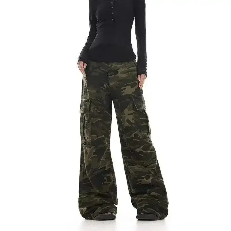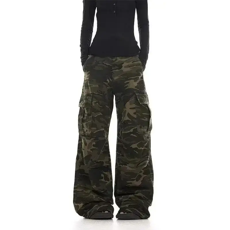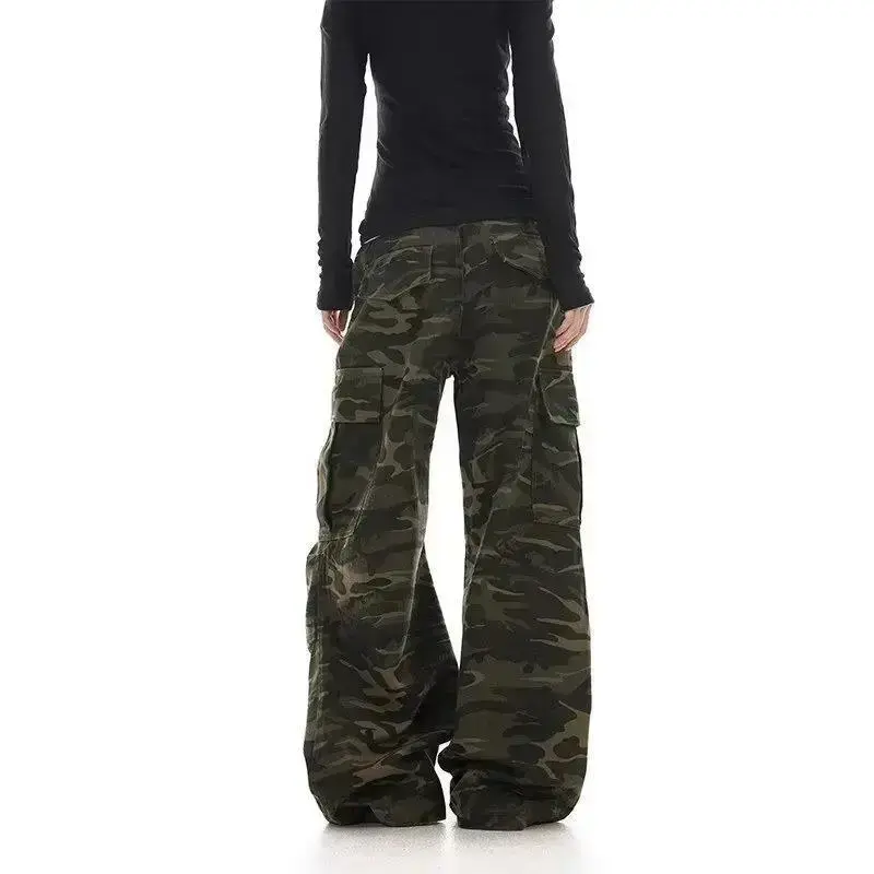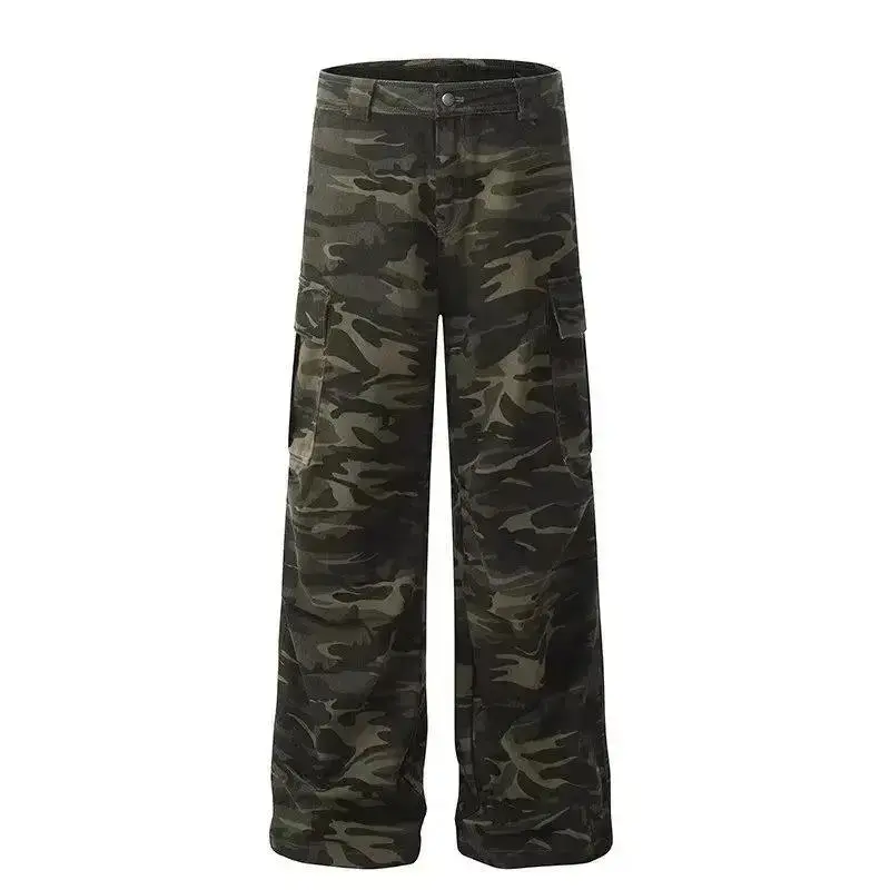 American retro washed design camouflage work pants for men and women, loose straight leg multi pocket wide leg casual paratroope