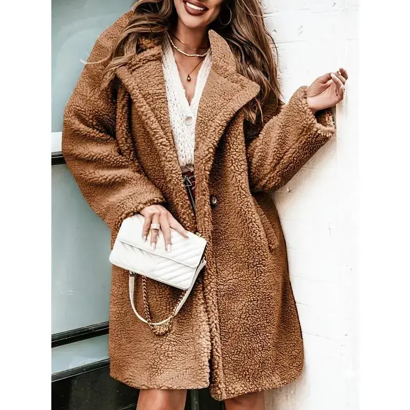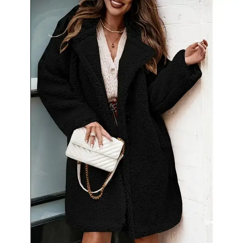 Women's Solid color Teddy Fleece Mid-Length Trench Coat - Oversized Lapel Collar, Plush Texture, Multiple Sizes (S-3XL), Ideal for Fall/Winter Casual & Formal Use, Warm Loose-Fit Outerwear with Pockets