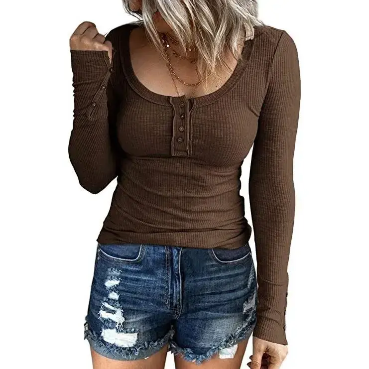 Women’s Long Sleeve Henley T Shirts Button Down Slim Fit Tops Scoop Neck Ribbed Knit Shirts