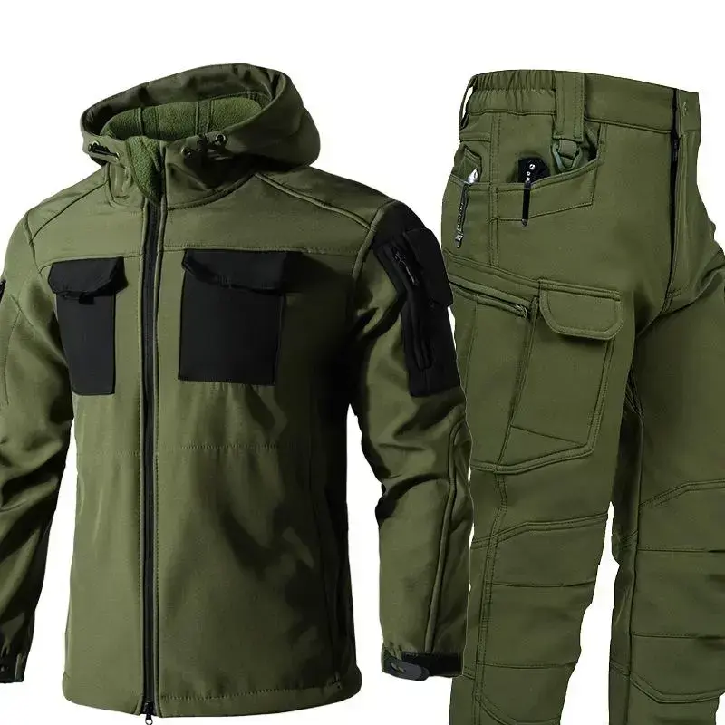 Outdoor Fleece-Lined Set: Multi-Pocket Softshell Jacket + Insulated Pants, Windproof and Durable Warm Fleece Suit,Winter & Fall Sharkskin Softshell Set: Outdoor Fleece-Lined Warm Jacket + Cargo Camo Jacket | Multi-Pocket, Windproof, Water-Resistant |