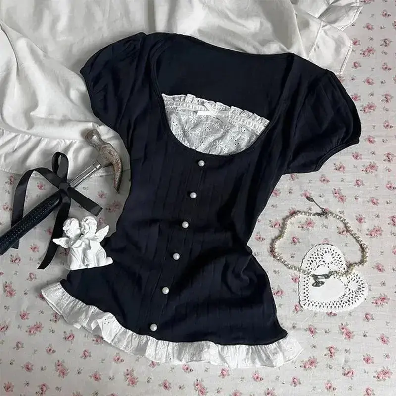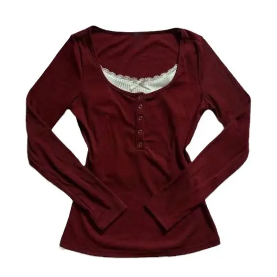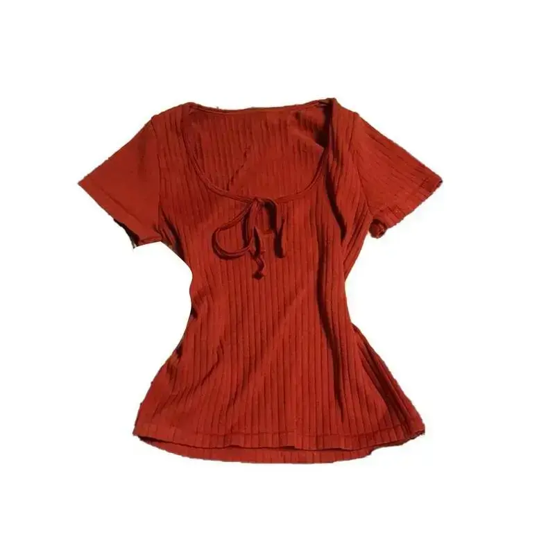 Y2K Vintage Harajuku Style Women's Long Sleeve Bow Slim Ribbed T-Shirt for Daily Wear