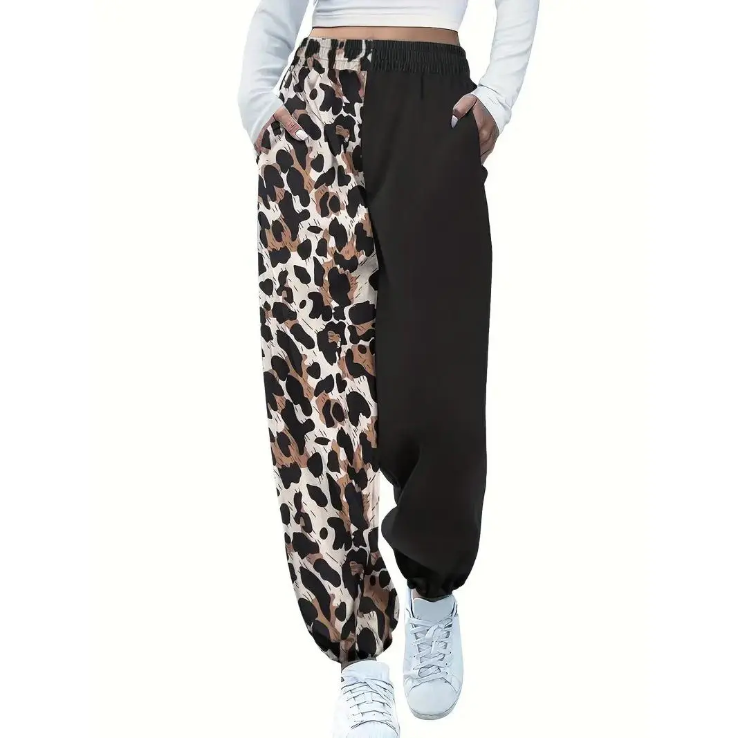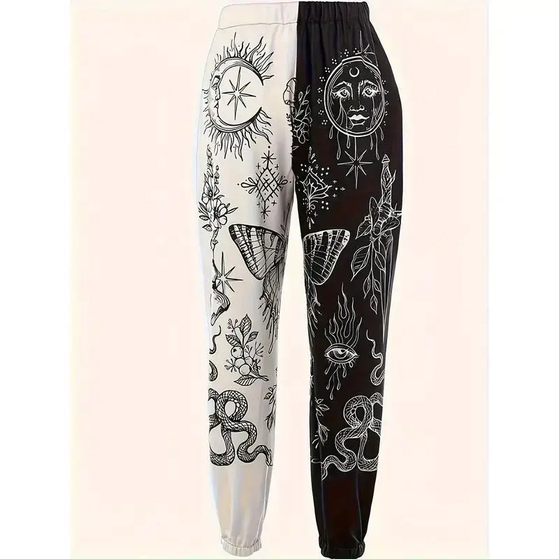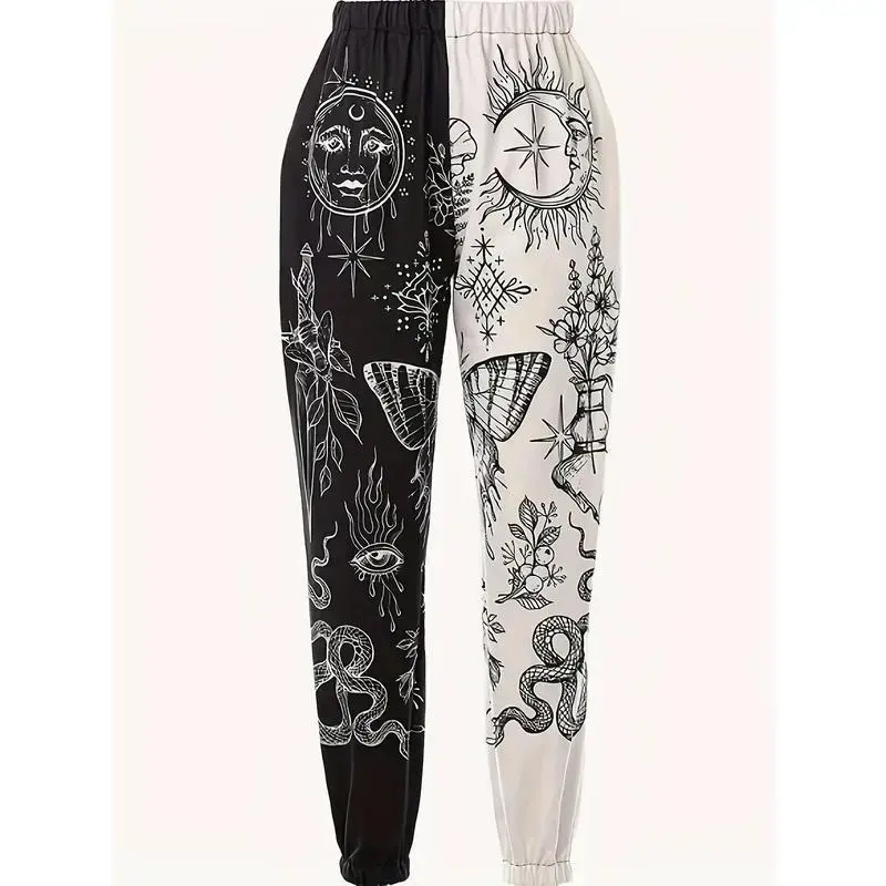 Women's Bohemian Hippie Joggers - High Waist, Colorblock Graphic Print with Sun and Moon Design, Casual Loose Fit Yoga Pants, Polyester, Machine Washable - Perfect for All Seasons