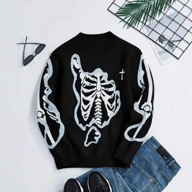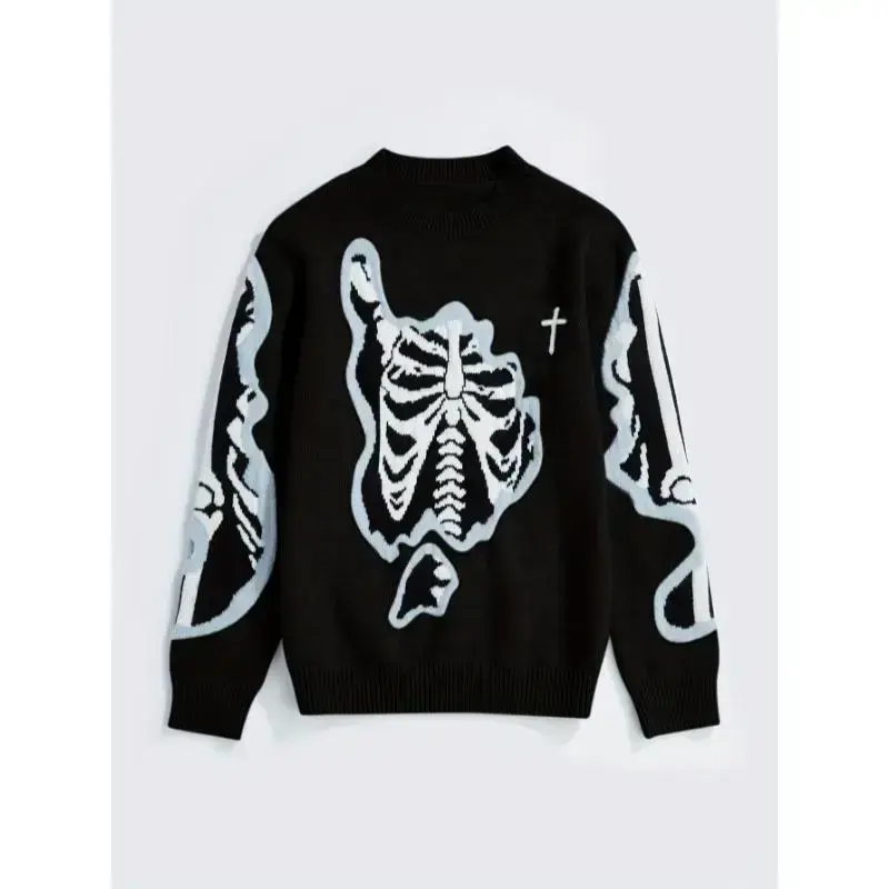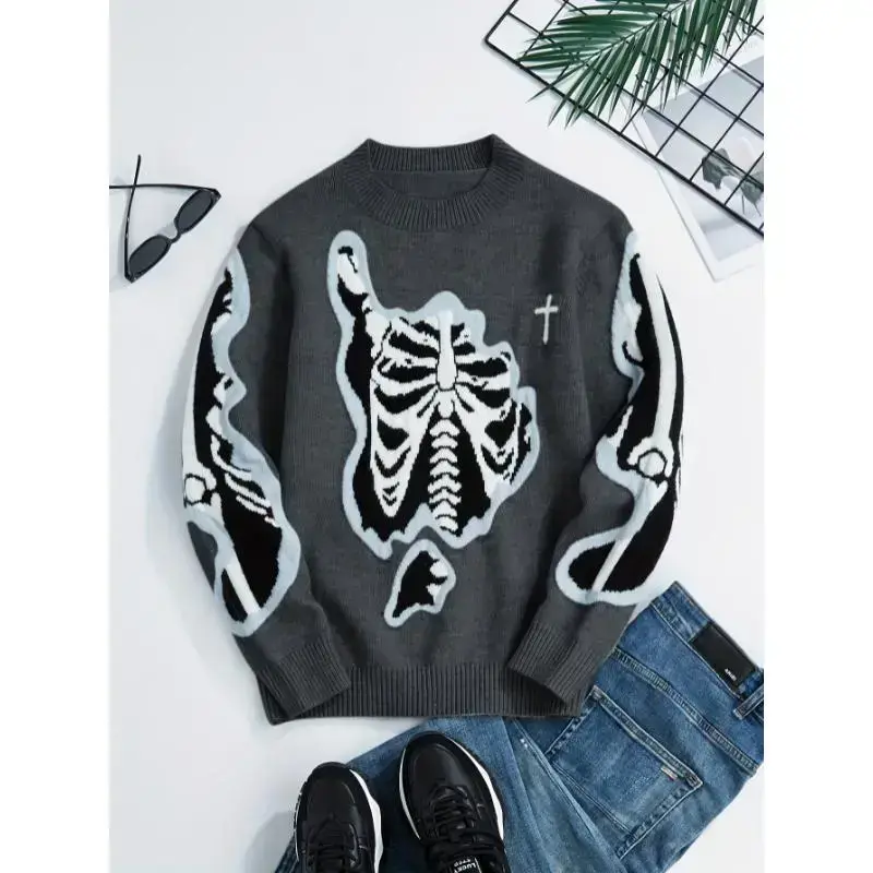 Men's Casual Skull Pattern Crew Neck Sweater ✨ Product Overview ✨ This men's casual sweater features a skull pattern and a crew neck design. Made from a blend of 52% acrylic, 28% polyamide, and 20% polyester, it offers medium stretch. The sweater is perfect for fall and winter fashion. It has a regular fit and is machine washable, but not suitable for dry cleaning. This sweater is made in Guangdong, China. Item ID: YE284390.