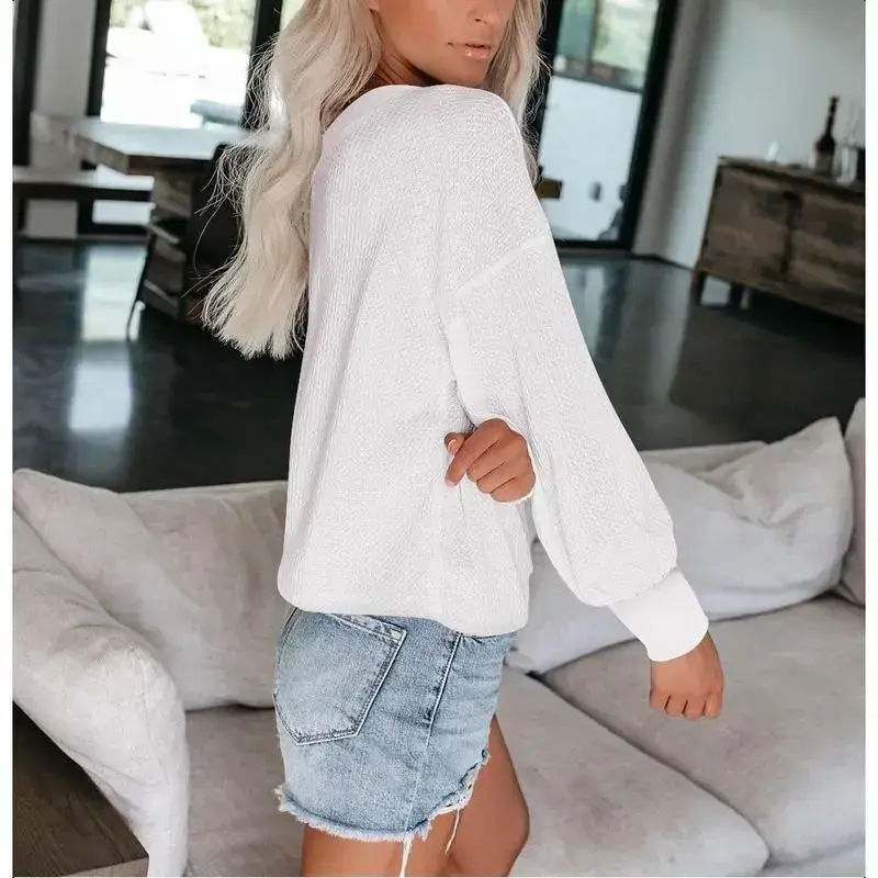 Dokotoo Womens Waffle Knit Tops Fashion Long Lantern Sleeve Casual Blouses V Neck Oversized T Shirts