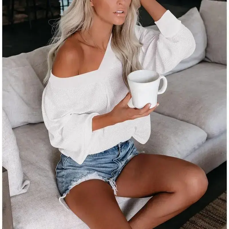 Womens Oversized Off The Shoulder Tops Long Sleeve Waffle Knit Shirt Drop Shoulder Sweater Top