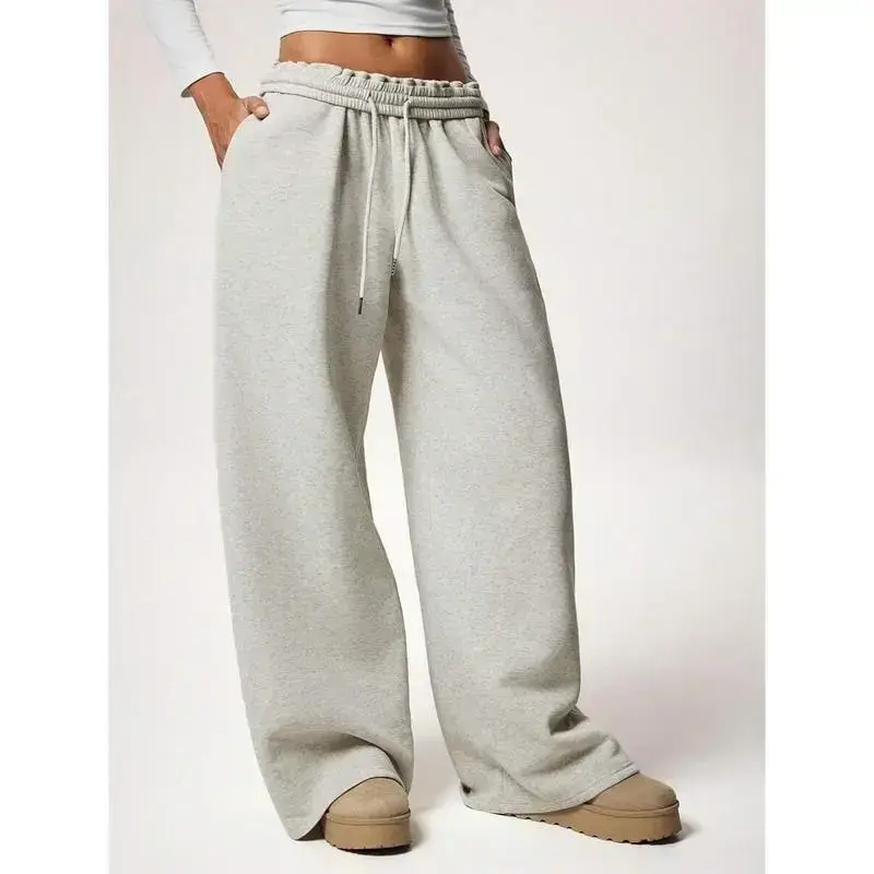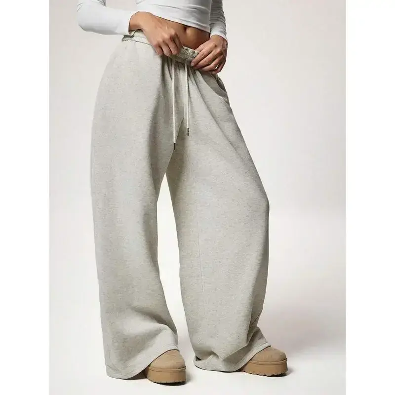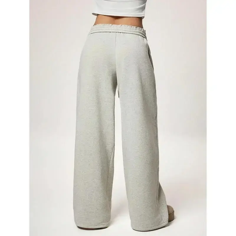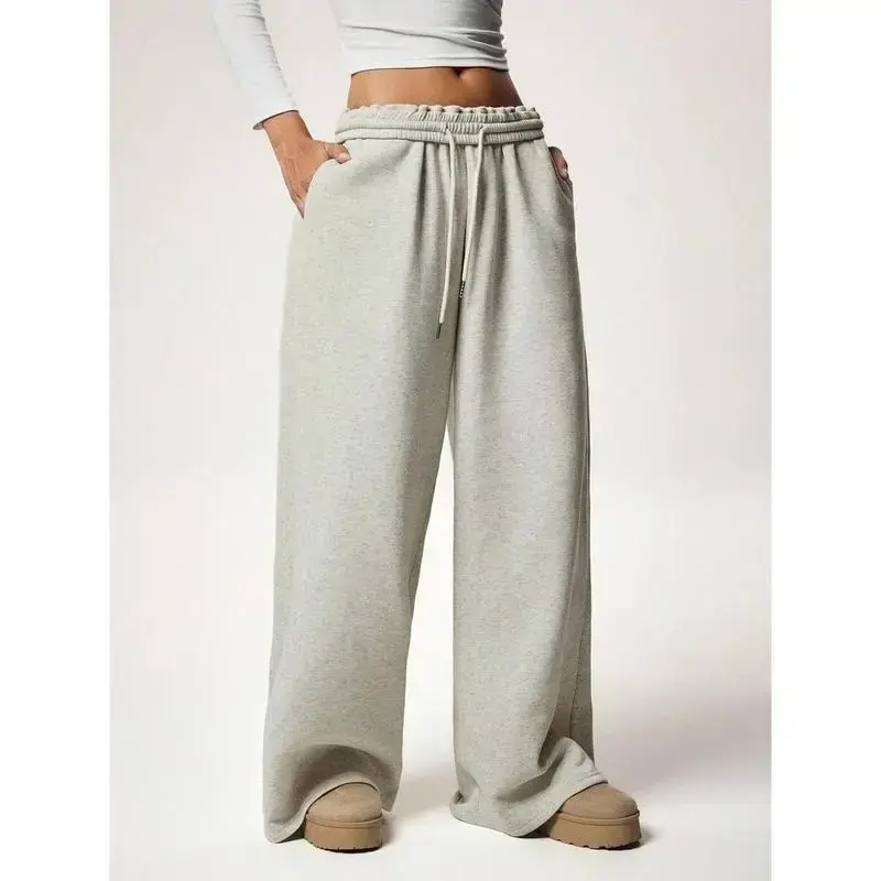 Winter New Thermal Lined Thick Casual Versatile High Waist Elastic Waist Loose Wide Leg Sweatpants Fabric Fit Womenswear Bottom Drawstring Polyester Basic Minimalist Grey