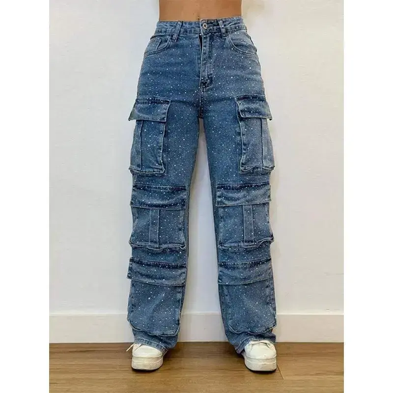 Plus Size Women's High Waist Cargo Denim Jeans With Full Rhinestones Sparkling Casual Baggy Pants Streetwear Chic Daily Trousers Womenswear Bottom Check BasicNO.159