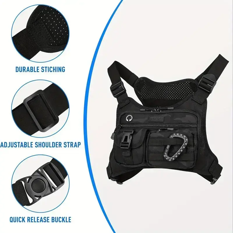 Portable, comfortable, and convenient: Our chest pack is a great choice for sports utility. Measuring 10.2" x 6.3" x 2.5", it features Molle webbing and a climbing buckle design. Whether you're strolling in the park or working out at the gym, our essentials-like your phone, earbuds, and wallet-are within reach and adjustable to fit your body. The chest pack comfortably sits on your arm and torso with four adjustable wide elastic straps and multiple compartments for easy storage. Designed with three unique pockets tailored to your daily needs, this running vest offers ample space for all your gear. Its multi-compartment layout ensures quick access to everything you need, saving time searching and freeing up more sweat sessions.