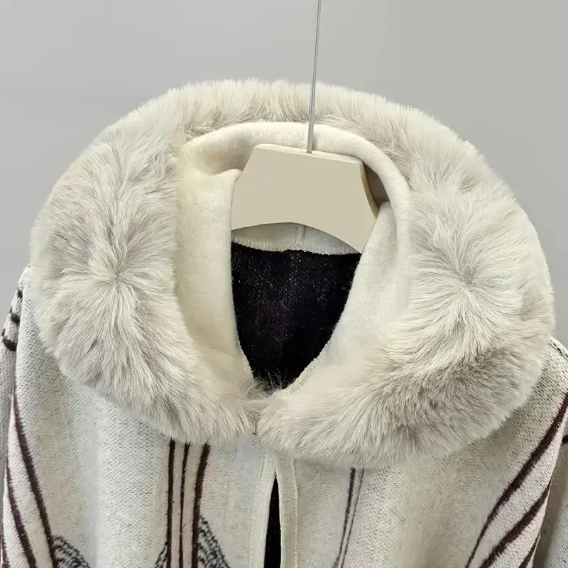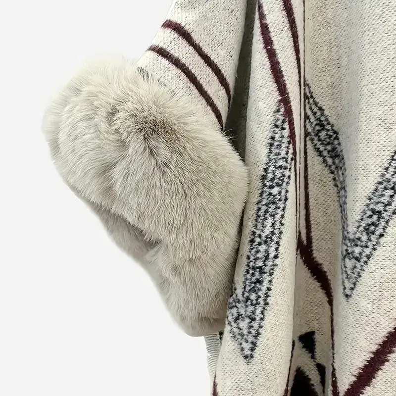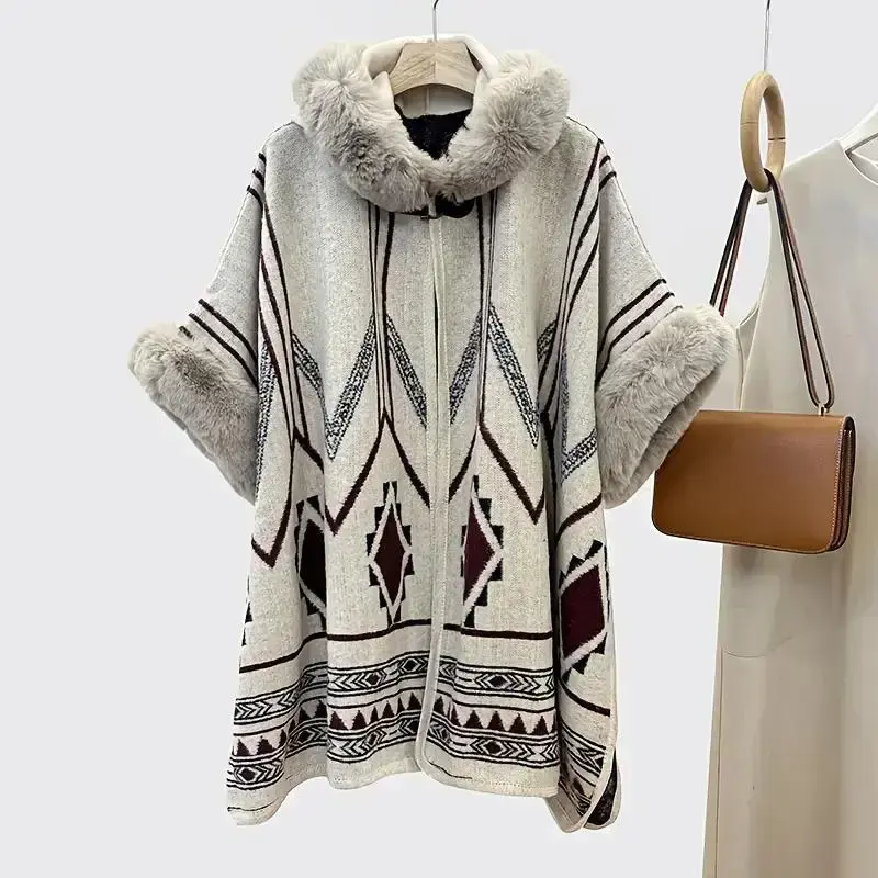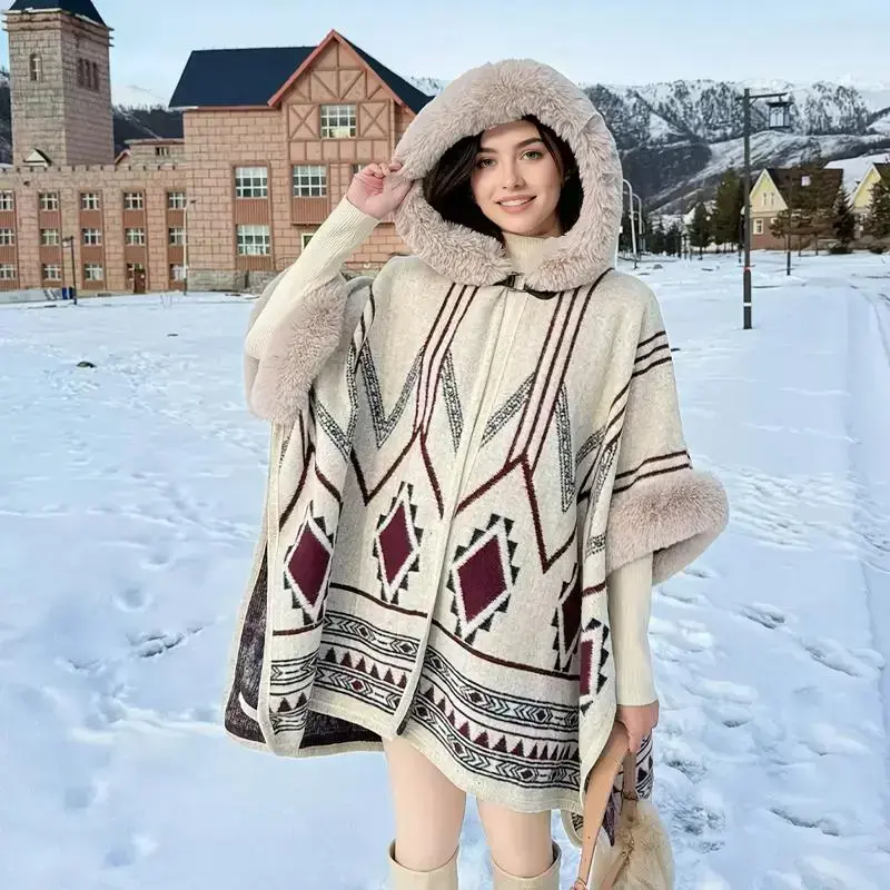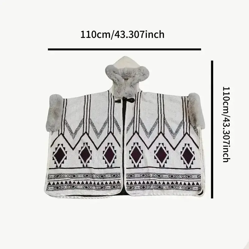 1 piece of vintage exotic ethnic style hooded shawl with off-white as the base color, paired with dark-toned geometric patterns and plush decoration, exquisite and warm. Suitable for scenarios: artistic performances, winter strolls in ancient towns, suita