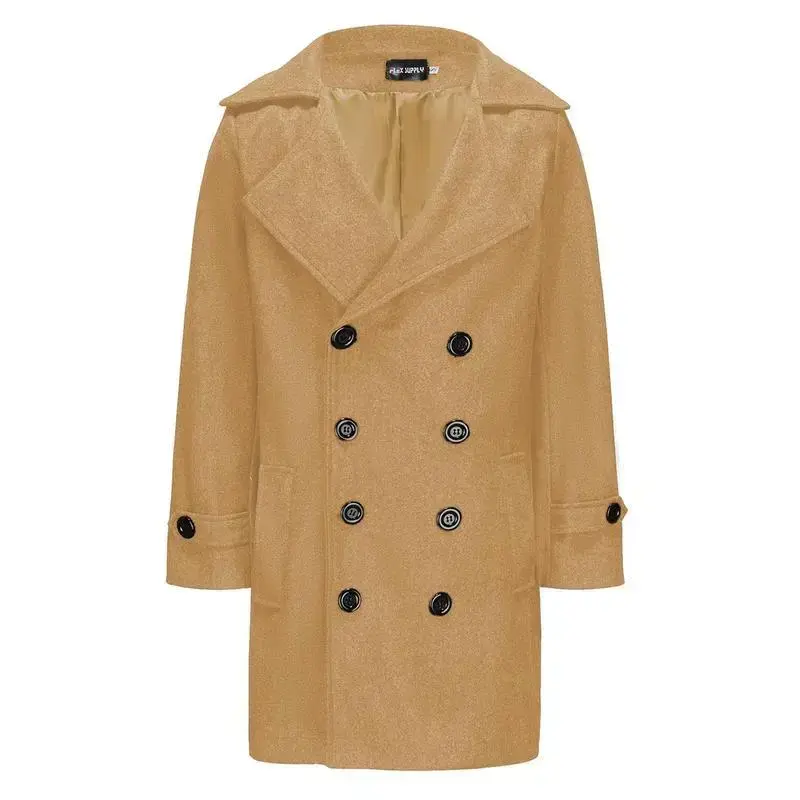 Elegant Men's Gray Tweed Pea Coat ✨ Product Overview ✨ The Elegant Men's Gray Tweed Pea Coat is a warm, double-breasted, long-sleeved coat with side pockets and brown trim. It features a casual solid color design, perfect for streetwear. The coat is made of 95% polyester and 5% cotton, with a woven fabric. It has a stand collar and a double-button closure. Ideal for fall and winter, this pea coat is a versatile addition to your wardrobe. Material and Care Style and Fit