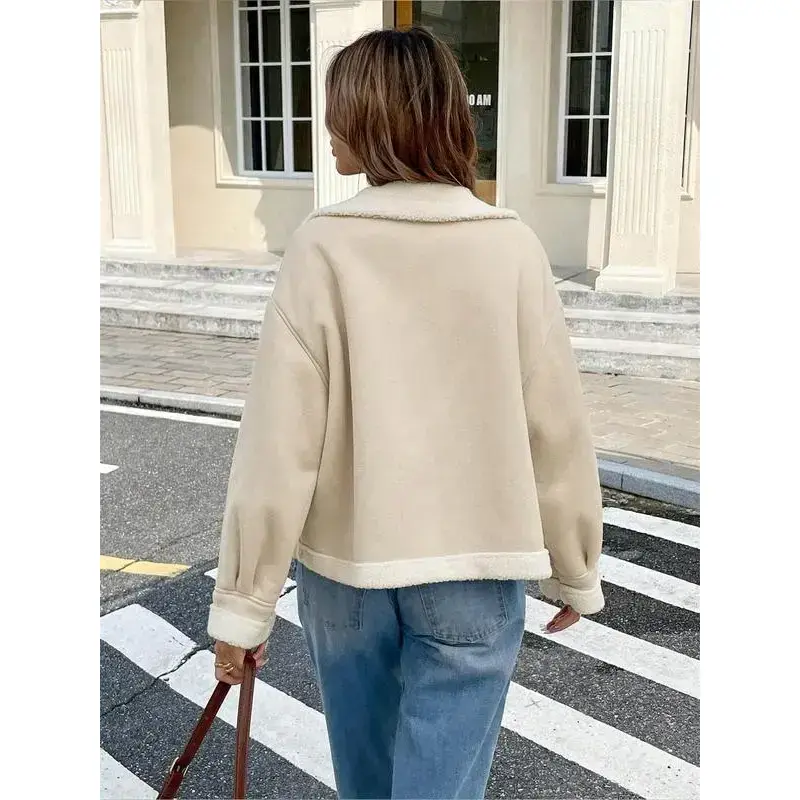 Women's casual loose fur coats, short lamb wool jackets, bomber jackets, flight jackets, with zipper closures, large lapels and side pocket designs, fashionable cold-resistant coats, street-style long-sleeved tops
