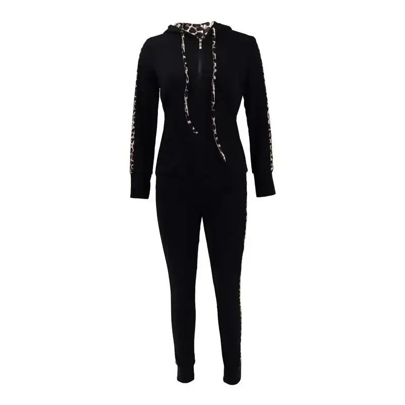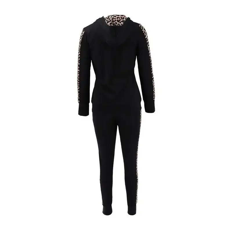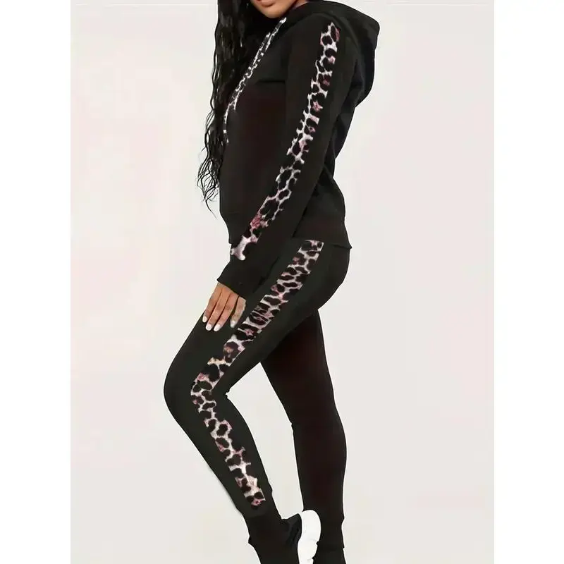 Leopard print casual two-piece drawstring hoodie suit for women