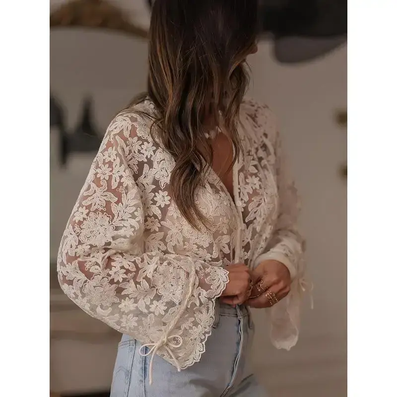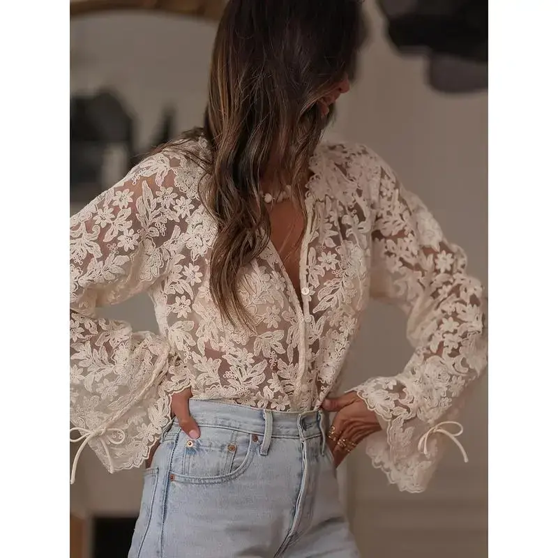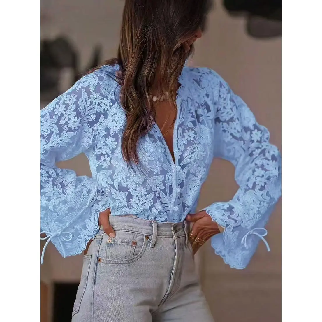 Women Causal Loose Flower V Neck Long Flare Sleeve Button-up Sheer Lace Blouse