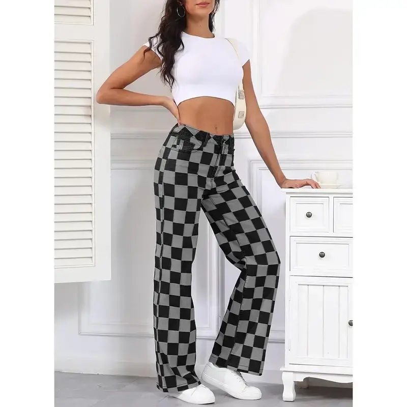 Women's Wide Leg Jeans ✨ Soft Stretch Fabric ✨Crafted from comfy and soft denim fabric, these women's jeans offer a soft, breathable feel. The mid-weight denim maintains its shape while draping effortlessly. Enjoy just-right stretch for all-day comfort. Please check our detailed sizing chart before ordering for the perfect fit. Modern Checkered Pattern 🎨 On-Trend Checkered Pattern 🎨Featuring an on-trend checkered pattern and wide leg design, these pants combine bold visual appeal with straight-leg tailoring. The non-restrictive silhouette flatters all body types. The high rise waist gently contours your natural curves, providing smoothing support. 👖 Straight Leg Denim 🩳Designed for versatile styling, these pants complement slim sweaters, oversized leather jackets, or casual tees. Wear with boots for urban edge or sandals for weekend vibes. The durable yet soft fabric transitions seamlessly from brunch dates to casual Fridays at work.