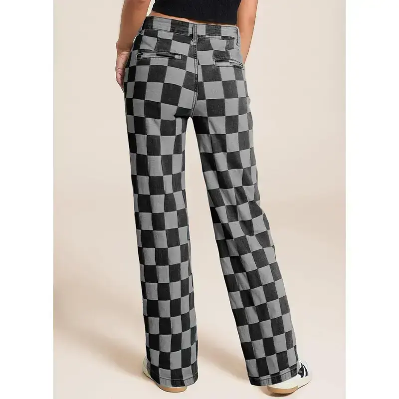 Women's Wide Leg Jeans High Waisted Stretchy Straight Leg Checkered Loose Denim Pants