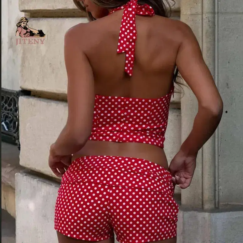 Women Summer Sets Red Polka Dot Halter Top and Shorts 2 Piece Size XL Womens Two Piece Outfits
