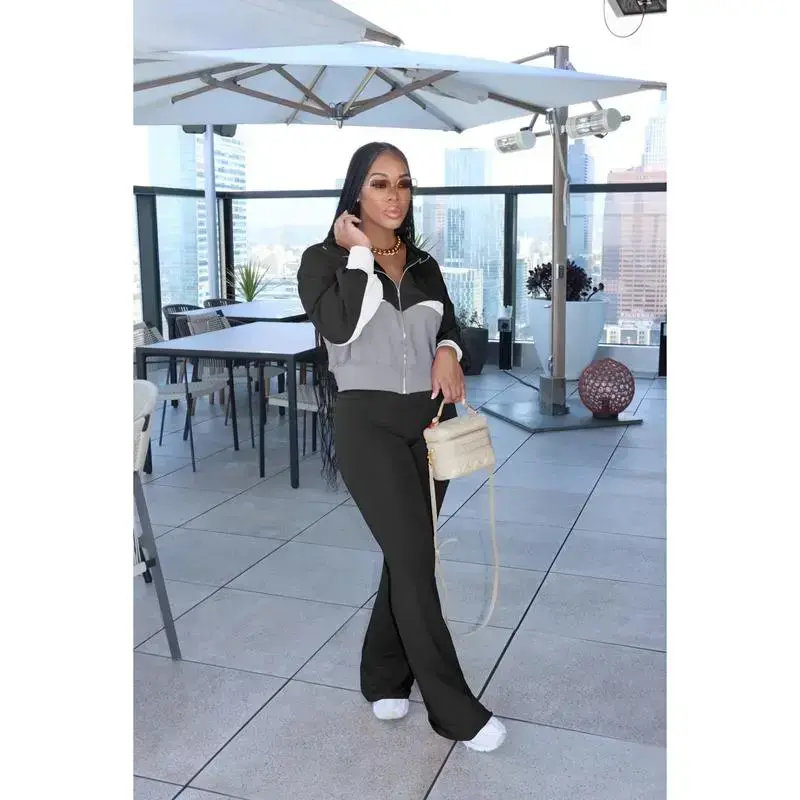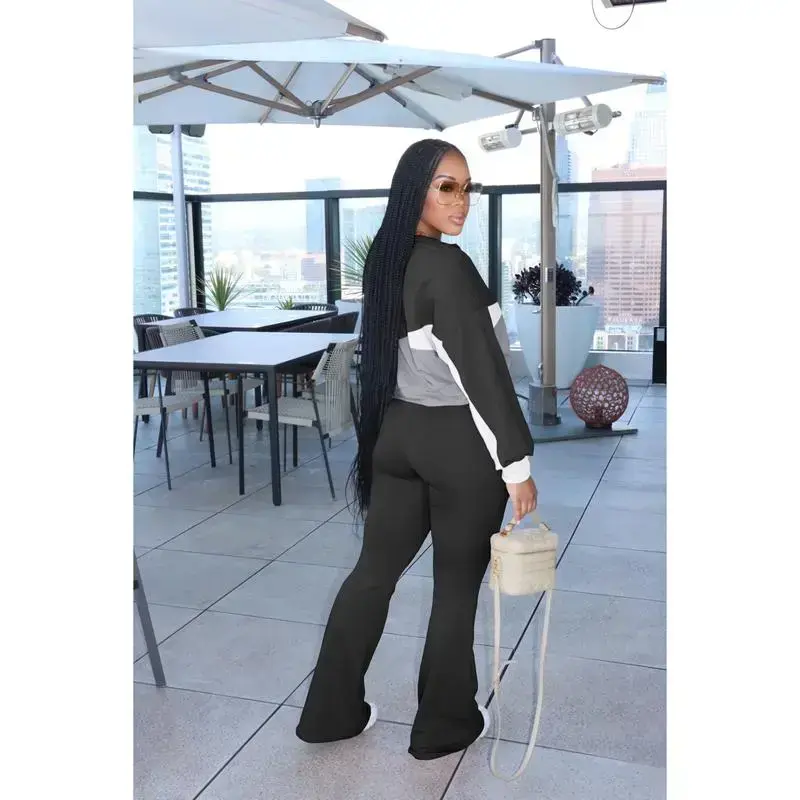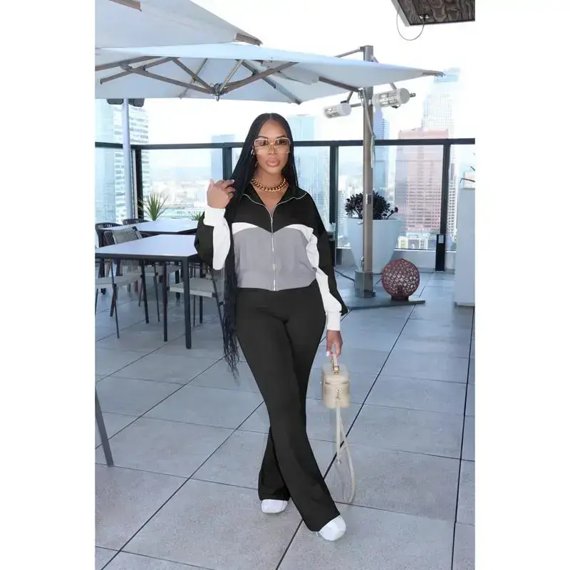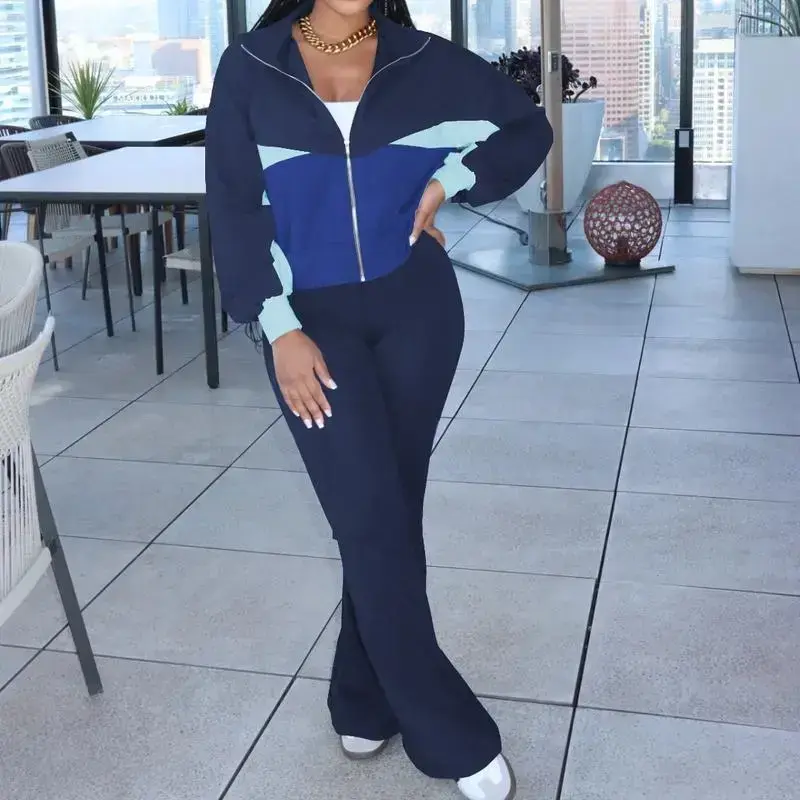 Women's Color Block 2 Piece Tracksuit Sets Long Sleeve Zip Up Crop Jacket and Flare Pants Casual Y2K Outfit