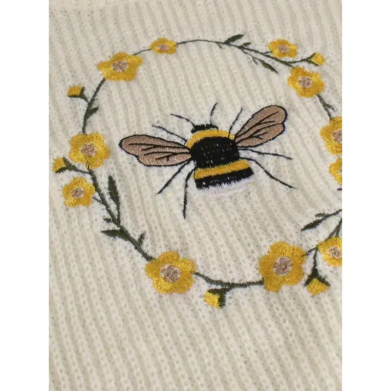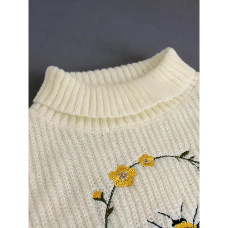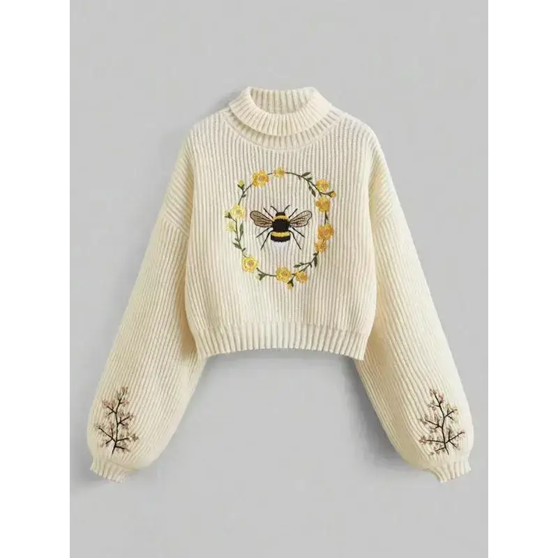 Women's Cartoon Bee Embroidered Drop Shoulder Sweater, Casual Knitted Long Sleeve Turtleneck Sweater Suitable for Spring and Autumn, Fashionable Women's Knitted Sweater, Daily Wear Fashionable Women's Knitted Sweater, Women's Clothing