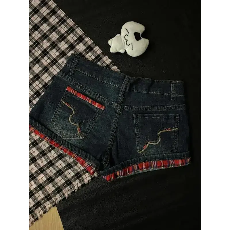 gym shorts Retro Red Plaid Splicing Denim Shorts Women's Summer Low Waist Slim Hip Wrap Hot Pants Y2k Shorts