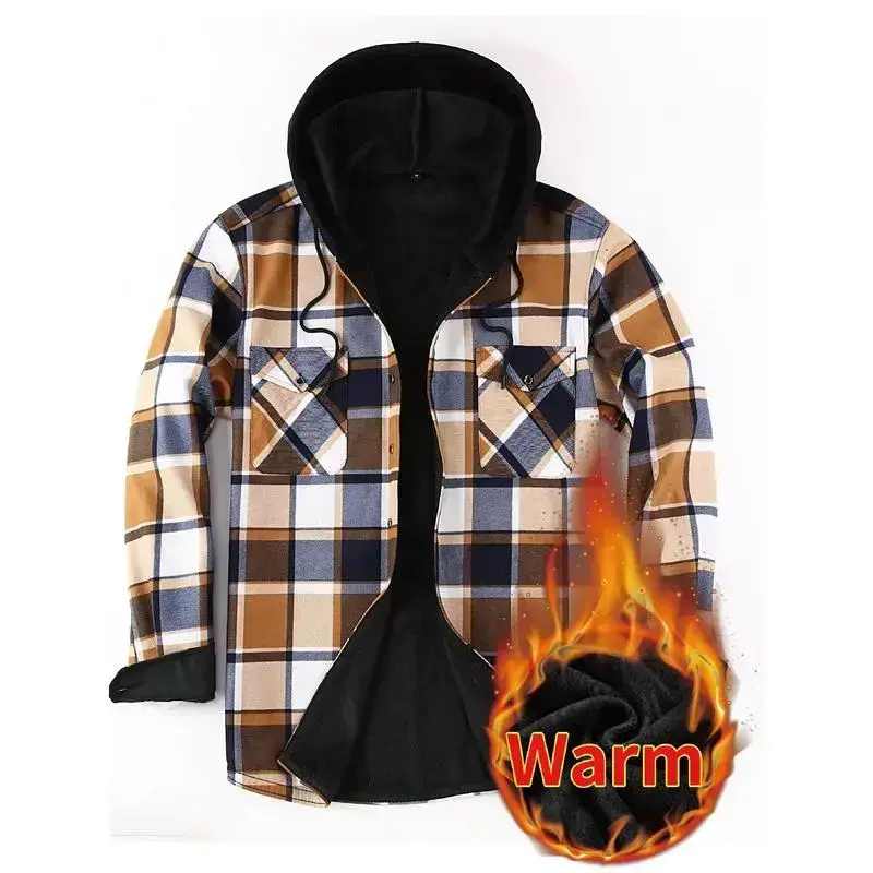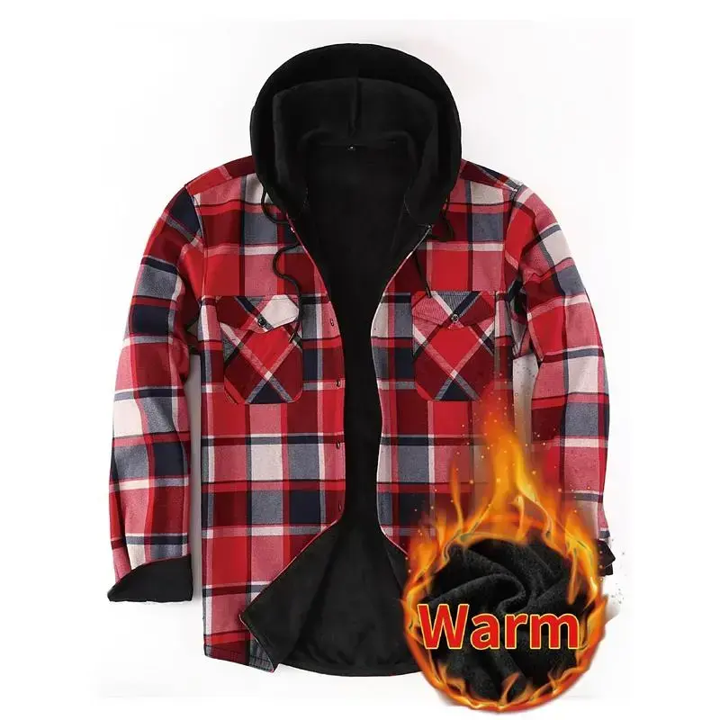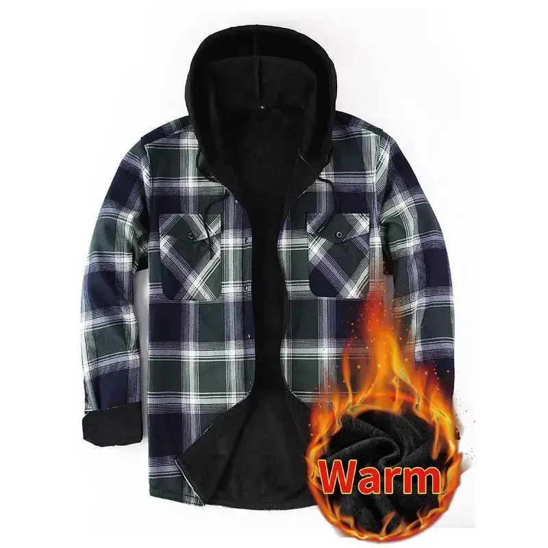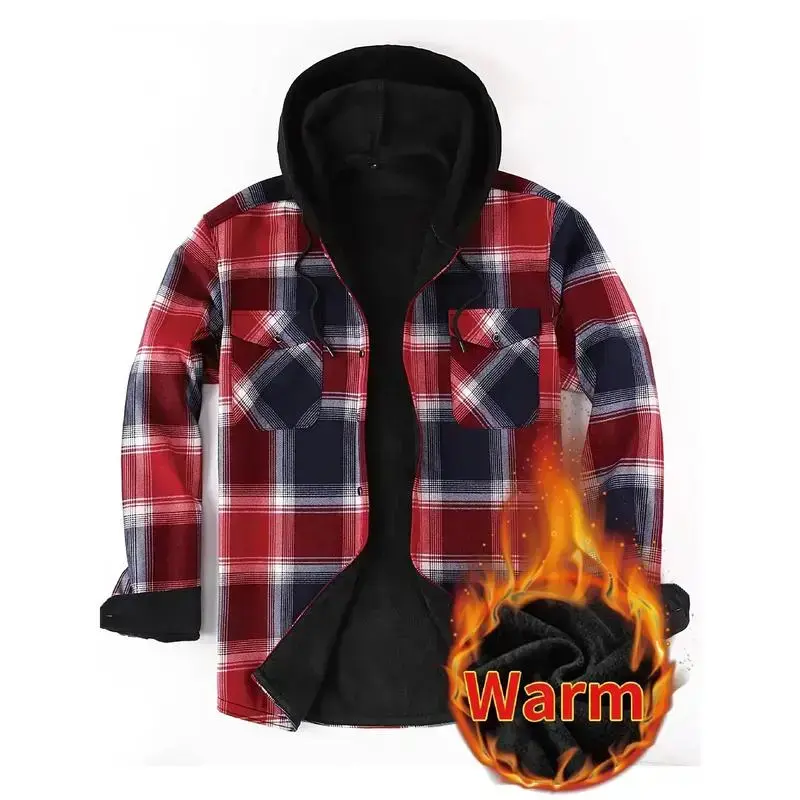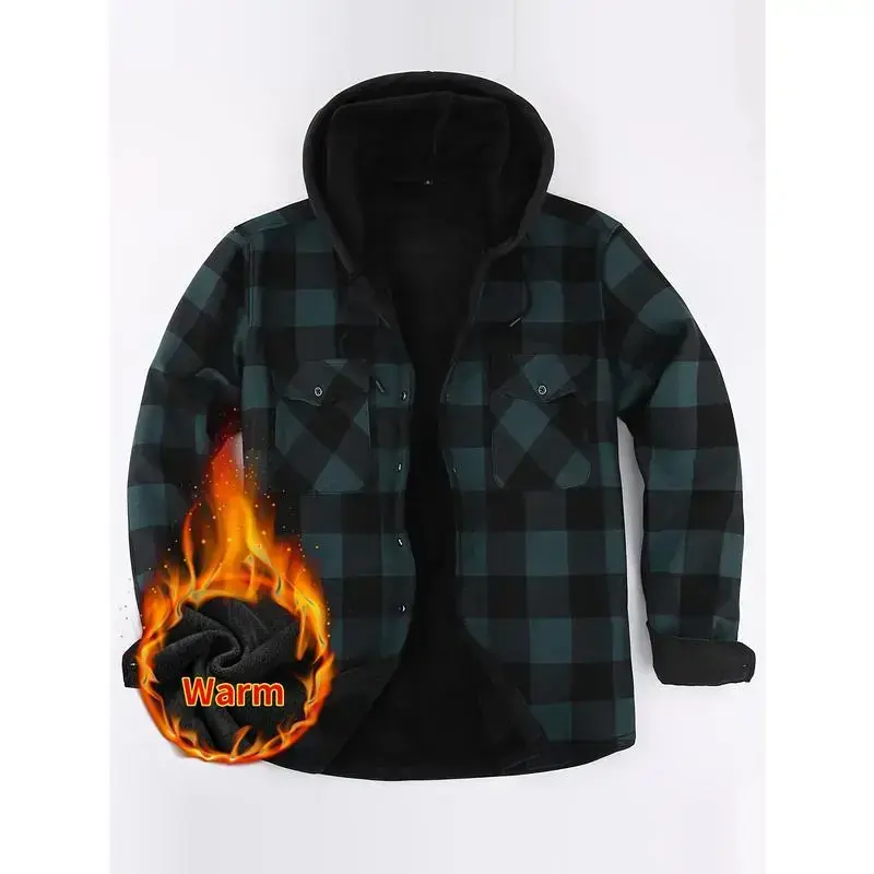 [Hooded Long Sleeve Button-Up] Hot Selling! Men's Checkered Flannel Shirt Jacket - Hooded Fleece-Lined Thickened Winter Coat, Long Sleeve Button-Up Overshirt with Double Chest Pockets, Relaxed Fit Outdoor Casual (EU Sizing)