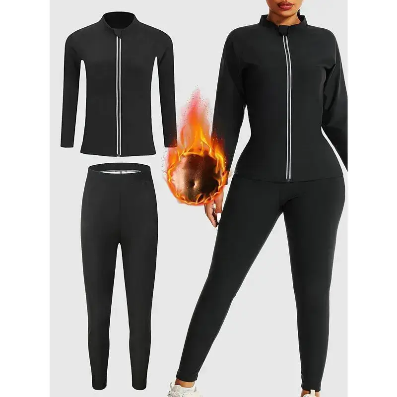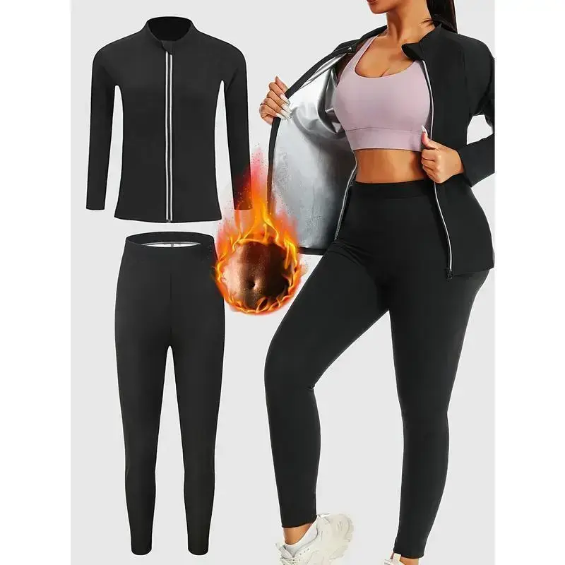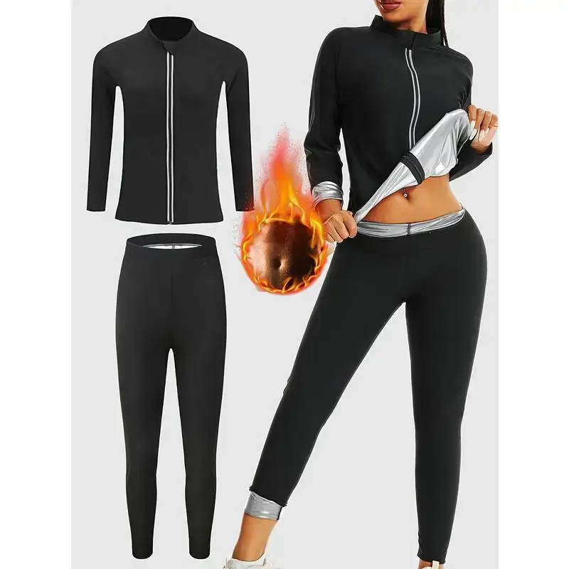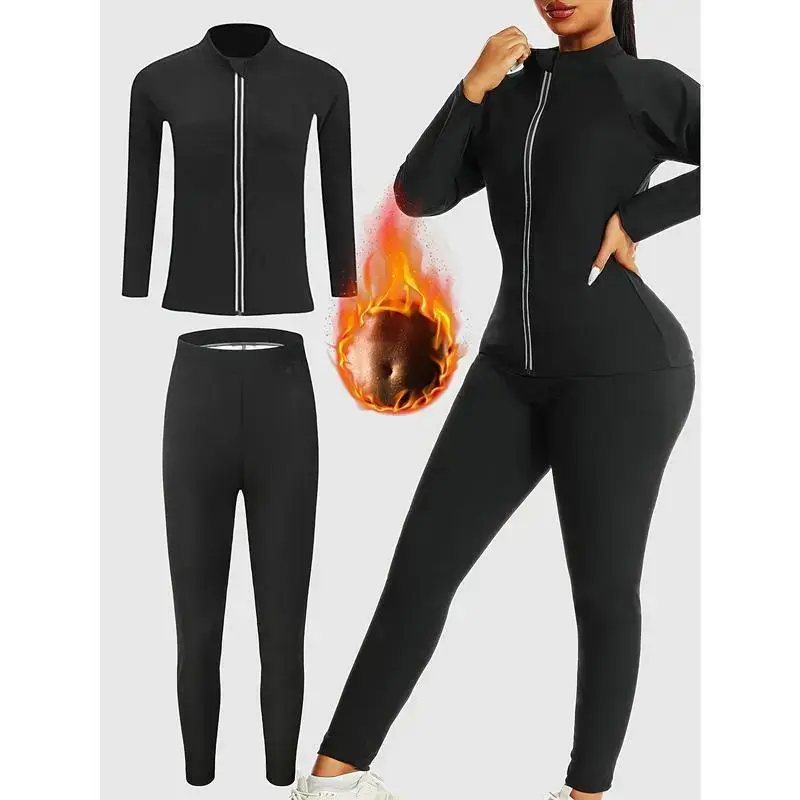 Women's Sauna Sweat Suit Set - Long Sleeve Zip-Up Jacket & High-Waist Leggings, Stretchy Polyester Blend, Machine Washable - Perfect for Yoga & Fitness Workouts