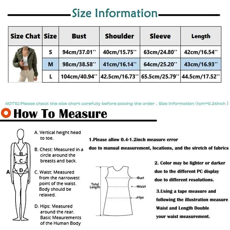 Women Winter Warm Thickened Overcoat Long Sleeve Solid Color Cardigan Short Coat Jacket With Hood And Zipper Features: 【Material】Soft, , extra comfort, classic cut, more durable.Cotton, polyester 【Features】 Two slanted pockets, please note that the hood is not removable.Closure: Zipper,Full front zip, buttons 【Style】This down vest is softer, breathable and very comfortable to wear. In the cold winter, this coat gets even warmer.The style is stylish, slim, slim, relaxed, simple and convertable. 【Unique Design】This vest is loose enough to fit thin clothes underneath, and is best suited for autumn and winter wear This vest can be worn with Jeans, sweaters, warm clothes,boots, sweaters, sports shoes Product Description: Gender:Women Season:Spring/Fall/Winter Material:Polyester Length:Short Decoration:Pocket Sleeve length:Long Sleeve Special Sleeve/Hooded/Pocket Splice design Pattern Type:Solid Neckline:Stand Collar Style:Daily/Casual Silhouette:Loose What you get:1 X Coat Note:Due to possible physical differences between different monitors, the product photography is illustrative and may not precisely reflect the actual color of the item received. Size Bust Shoulder Sleeve Length S 94cm/37.01'' 40cm/15.75'' 63cm/24.80'' 42cm/16.54'' M 98cm/38.58'' 41cm/16.14'' 64cm/25.20'' 43cm/16.93'' L 104cm/40.94'' 42.5cm/16.73'' 65.5cm/25.79'' 44.5cm/17.52'' Size:S Bust:94cm/37.01'' Shoulder:40cm/15.75'' Sleeve:63cm/24.80'' Length:42cm/16.54'' Size:M Bust:98cm/38.58'' Shoulder:41cm/16.14'' Sleeve:64cm/25.20'' Length:43cm/16.93'' Size:L Bust:104cm/40.94'' Shoulder:42.5cm/16.73'' Sleeve:65.5cm/25.79'' Length:44.5cm/17.52''
