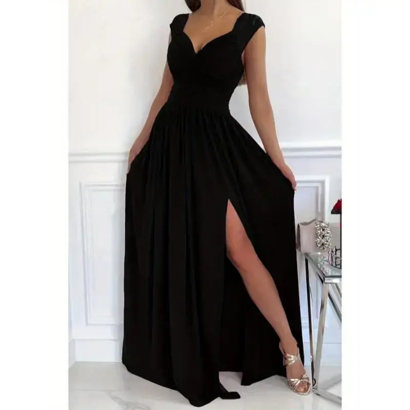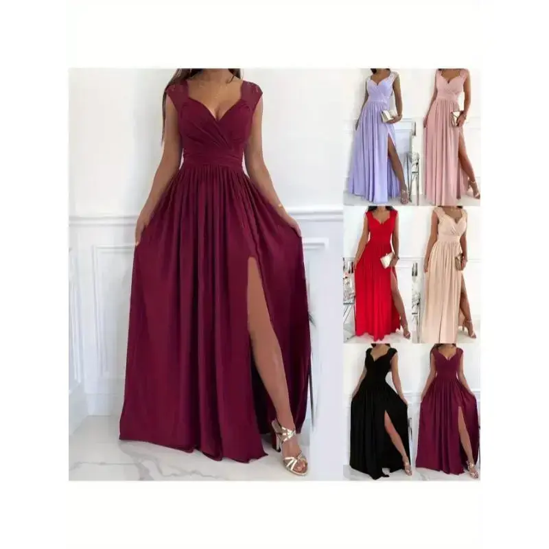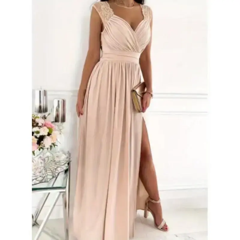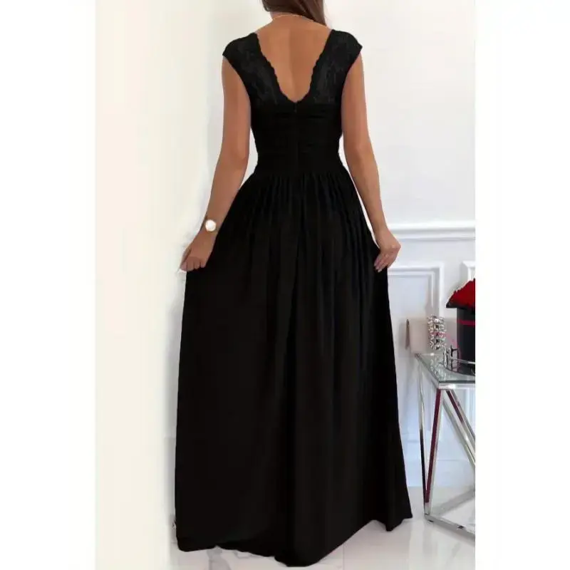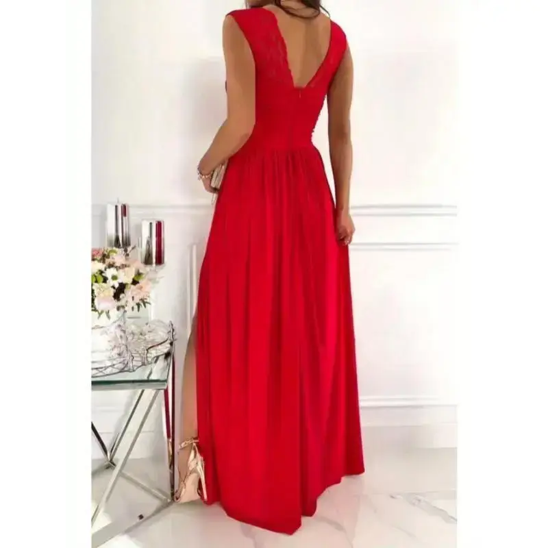 Women's Backless Lace Sleeveless Dress with Asymmetrical Hem Slit - V-Neck A-Line Silhouette, Machine Washable Elegant Party Dress for Dating, Vacations & Special Occasions, Vacation Attire, Sophisticated Craftsmanship Formal Wome