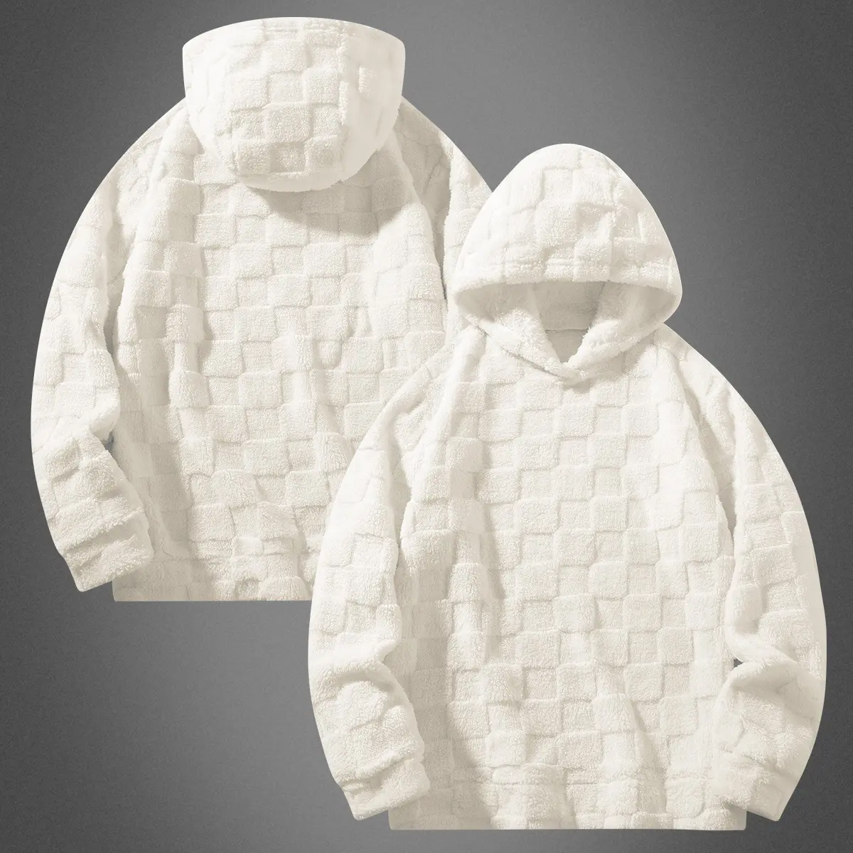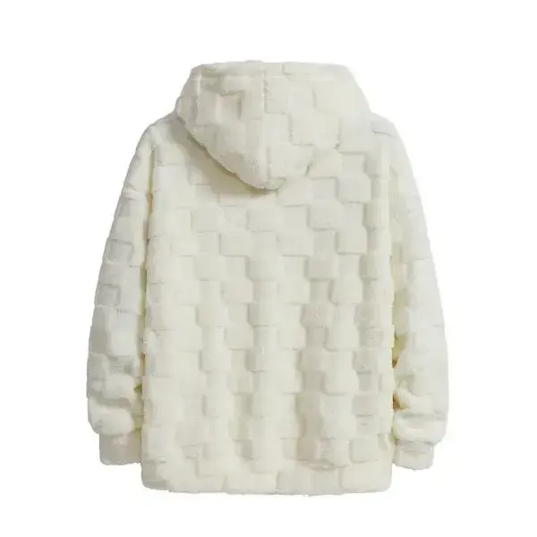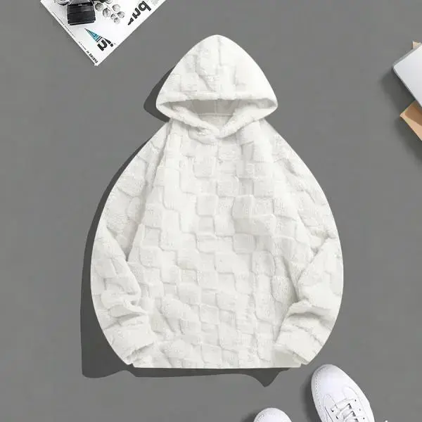 White plush hooded sweater, simple and casual style, soft and fluffy feel, with a hood design adds a sense of freedom, suitable for young people's campus wear and weekend outings, it is a versatile top for autumn and winter.