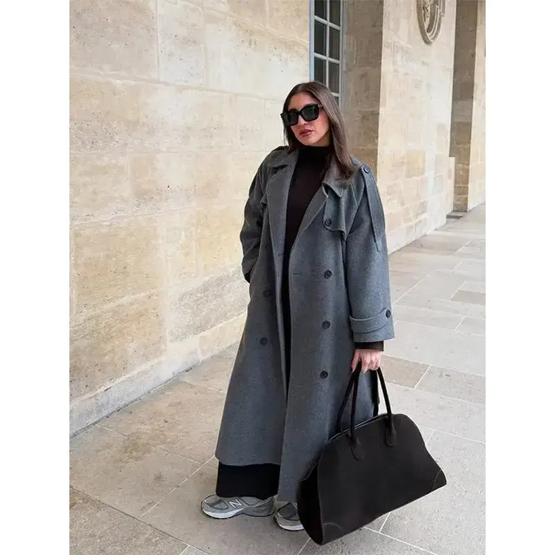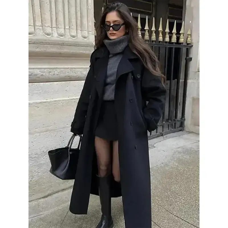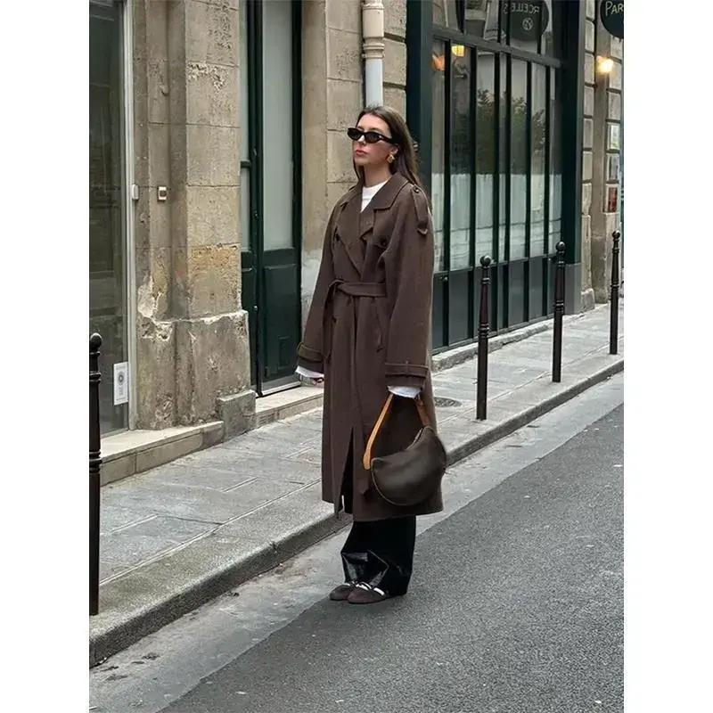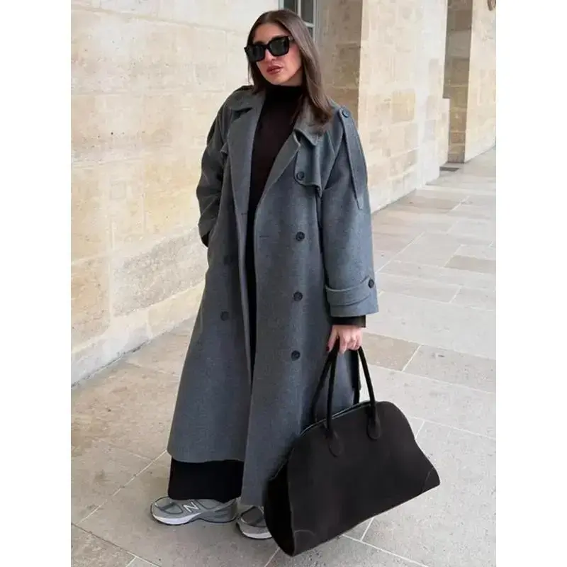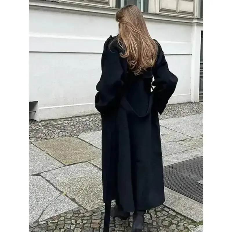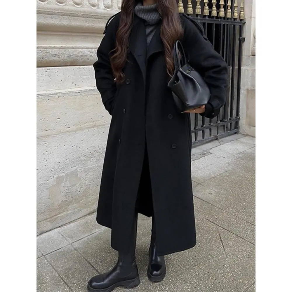 Elegant Women's Woolen Overcoat With Belt Loose Lapel Double Breasted Full Sleeve Long Coats 2025 Autumn Winter Lady Trench Coat