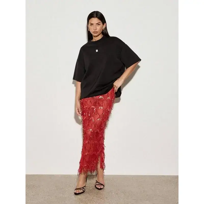 ��Dynamic Accents��: Features shimmering sequins and tassels that create a striking, eye-catching visual appeal with movement. ��Long Length��: Designed as a long skirt that enhances the overall silhouette, lending a dramatic flair to your look. ��Sheer Fabric��: Crafted from a sheer mesh material, providing an ethereal quality while maintaining an alluring edge. ��Fringe Detailing��: Incorporates fringe elements that deliver a sense of rhythm and playfulness to the overall outfit. ��H Type Silhouette��: The H Type silhouette provides a fitted structure that flatters varied body types while emphasizing curves.
