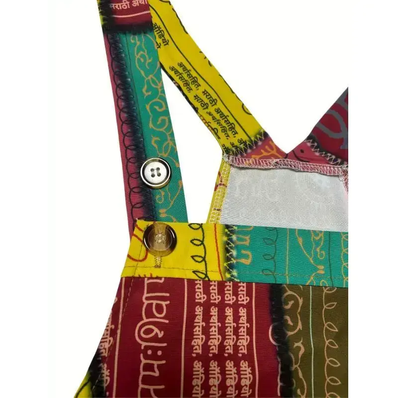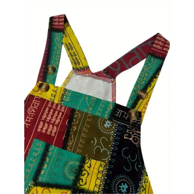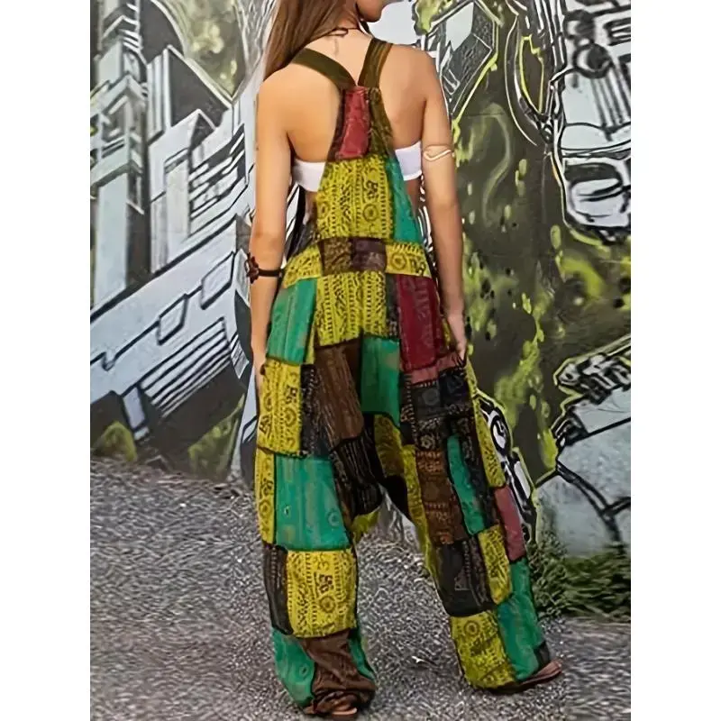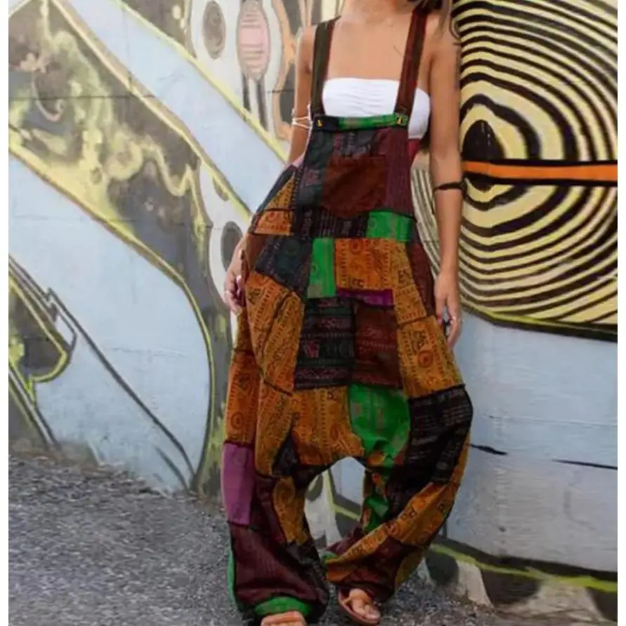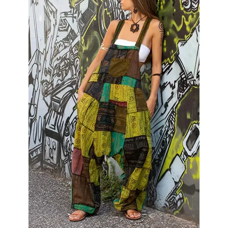 [Patchwork Print Overall Jumpsuit] Patchwork Print Overall Jumpsuit, Vintage Baggy Jumpsuit, Women's Clothing Fabric Womenswear