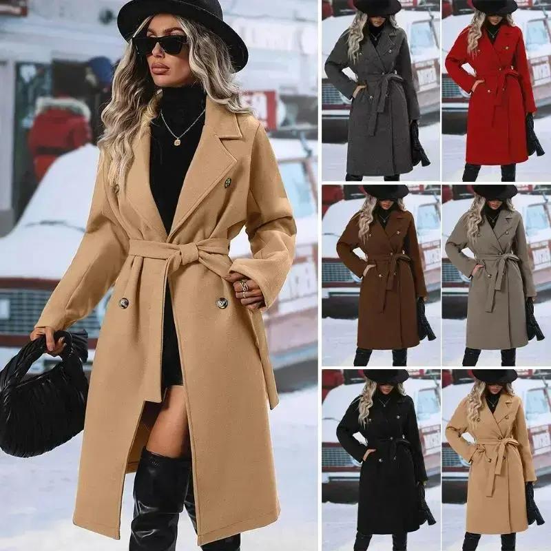 Women Turn Down Collar Thick Midi Length Wool Coat Pockets Casual Full Sleeve Double Breasted Blends Coats 2025 Autumn Winter