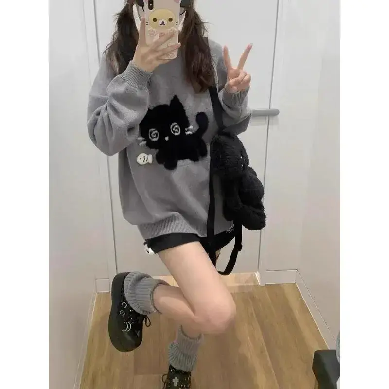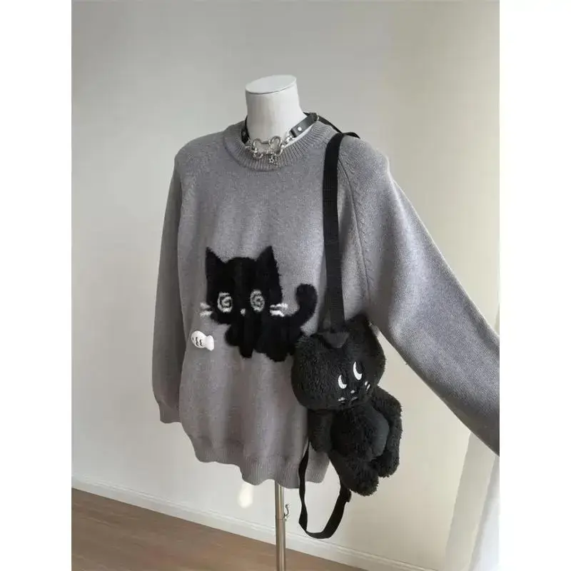 Gray Cute Cat O-neck Knit Elegant Pullover Woman 2024 Winter Design Harajuku Tops Feamale Y2k Long Sleeve Retro Sweaters Mujer