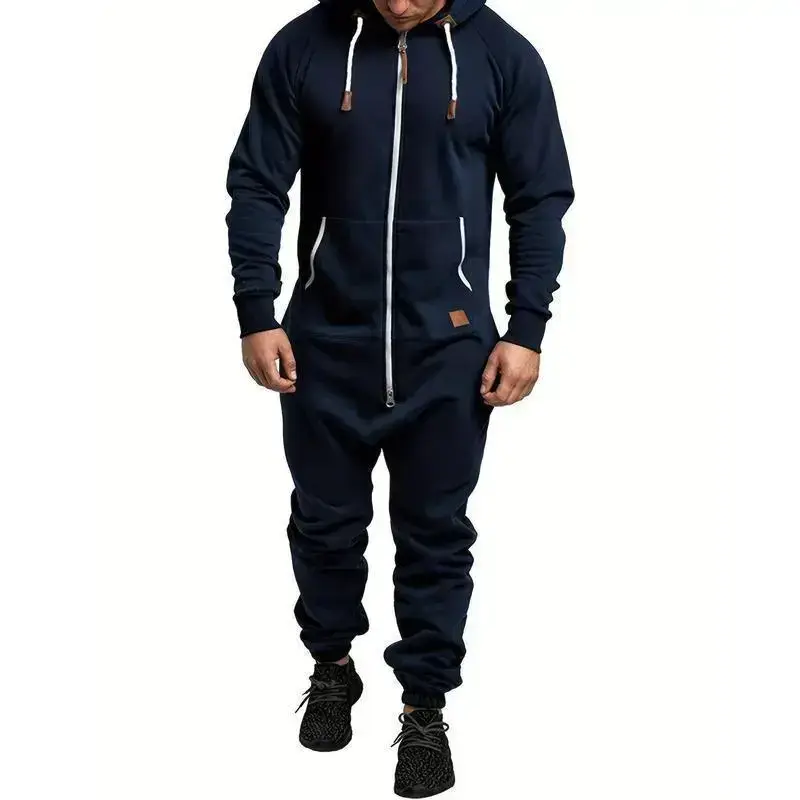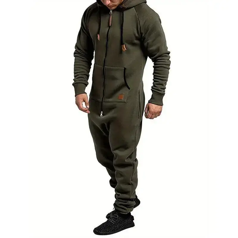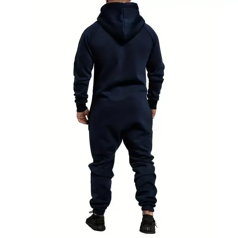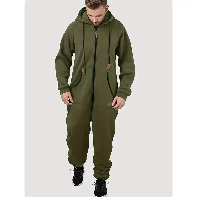 Men's Overall Suit Solid Color Long Sleeve Hooded Fleece Warm Jumpsuit Autumn Winter Men's Warm Pants