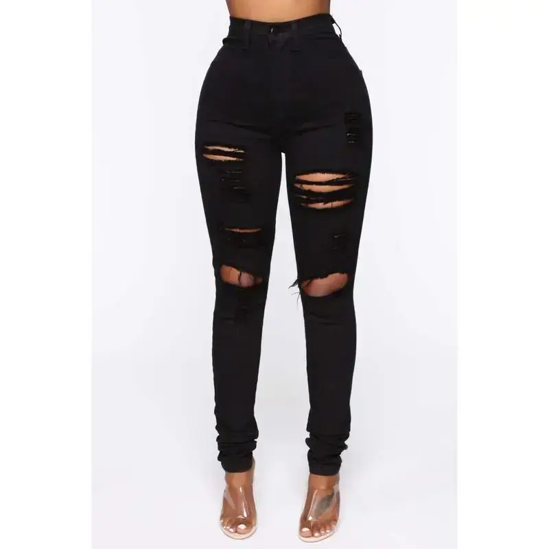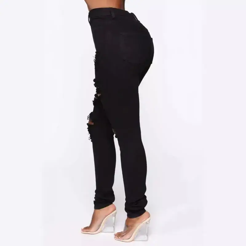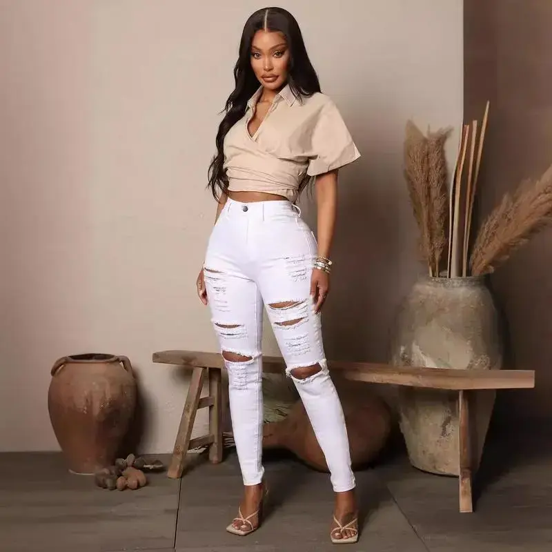 New Style Black and White Stretch Ripped Jeans for Women Skinny Pants Womenswear Bottom